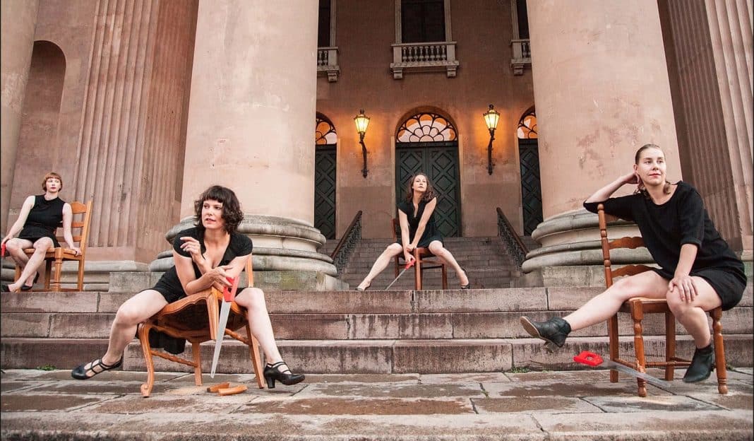 Dans cette performance chorégraphique en déséquilibre, cinq femmes élégantes vêtues de noir sont les concertistes d’un seul instrument, une scie, avec laquelle elles entreprennent, chacune, de découper leur chaise. L’élégance et la sophistication laisse place à l’absurde lorsque la gravité prend le dessus. D’une idée simple en apparence, la compagnie Reckless Sleepers crée un spectacle aux possibilités infinies où la chaise devient le lieu de l’équilibre fragile et de l’insolence.