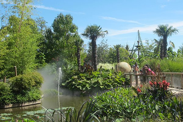 Quatre thèmes racontent l’univers végétal : le « végétal convoité » évoque les grandes expéditions du XVIIIe s. (Bougainville, d’Entrecasteaux, Cook, Lapérouse, etc…) et du XIXe s (Humboldt, Bonpland…). Le moyen ? La reconstitution d’un port, avec ses docks, ses caisses, ses coffres… un mix de Canton et de Nantes. Véritable capharnaüm aux parfums d’épices. Le « végétal généreux » explique le rôle essentiel des plantes dans notre quotidien, que ce soit dans l’alimentaire, la pharmacopée, l’ornement et (oui, aussi !) la sorcellerie ! On passe de l’allée des grands-mères au parcours du roi René, d’un potager extraordinaire aux vignes bordées de gabions remplis de calcaire, d’argile et d’ardoise – symbolisant les trois couleurs du royaume. Le « végétal mystérieux » s’appuie sur des jeux et l’audiovisuel pour mieux comprendre le fonctionnement de la plante depuis l’explosion végétale à l’époque du Carbonifère (moins 300 millions d’années) au Crétacé. L’ambiance des prémices du monde est bien rendue par les plantes fossiles, les geysers, les cours d’eau d’où l’on s’attend à voir sortir des méchants dinos. Une grotte recouverte de sedums et pleine de plantes qui puent – carnivores ou pas – avalent les visiteurs qui ressortent de là bien contents ! Plus accueillante, une prairie où sèche le linge évoque l’histoire des plantes tinctoriales. Le « végétal apprivoisé » explique les stratagèmes de la plante pour (sur)vivre en milieu hostile et ceux de l’homme pour l’adapter à son paysage et à ses activités.