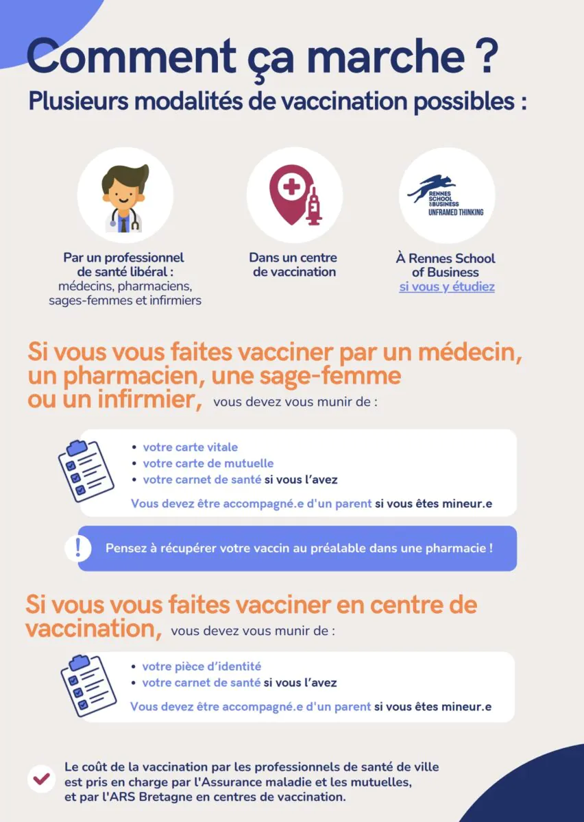 La campagne de vaccination démarre le lundi 3 mars 2025 au sein de l’école Rennes School of Business, puis à partir du jeudi 6 mars chez les professionnels de santé de ville et en centres de vaccination. Elle s’étalera sur plusieurs semaines consécutives afin de permettre à l’ensemble de la population cible d’accéder à la vaccination.