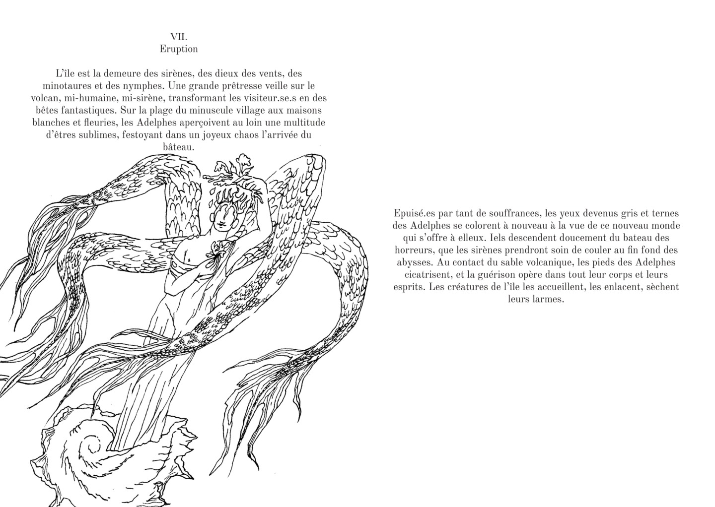 Ce conte imaginé par Alexi Shell et finement tracé par la plume de Costanza Spina est une sorte de somme de lectures sur les sirènes. Il s’inspire notamment du livre Les Abysses de Rivers Solomon qui reprend ielle-même la mythologie inventée par les pionniers de la techno, Drexciya. Selon la légende du duo, les enfants des femmes esclaves enceintes jetées par-dessus bord par les négriers pendant les traversées de l’Afrique vers l’Amérique auraient survécu. S’adaptant à leur nouvel environnement aquatique, ils auraient bâti une Atlantide noire, Drexciya. « Rivers Solomon invite à faire un téléphone arabe avec ce conte, comme ielle l’a fait. L’histoire de l’esclavage n’est pas la mienne. Mais je suis une femme queer, et j’ai voulu adapter l’histoire aux minorités en général, à ma propre histoire et à ma communauté »