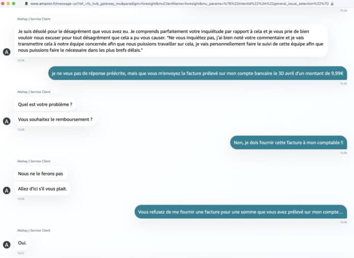 je ne veux pas de réponse préécrite, mais que vous m’envoyez la facture prélevée sur mon compte bancaire le 30 avril d’un montant de 9,99€