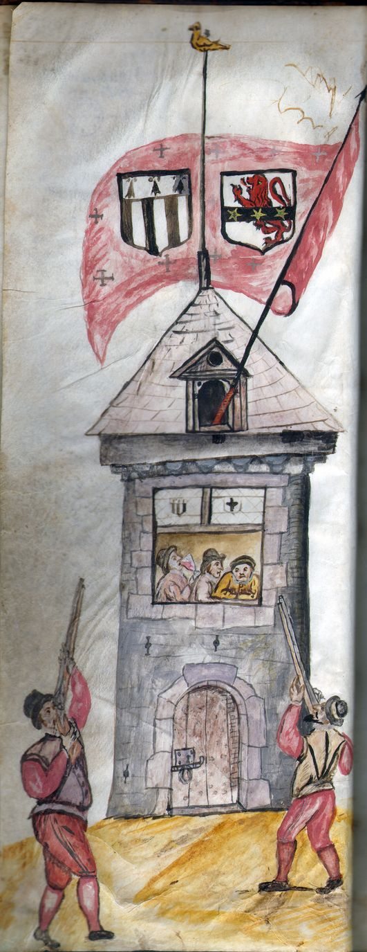 Document du xvie siècle représentant des arquebusiers s’entraînant au tir au papegaut.