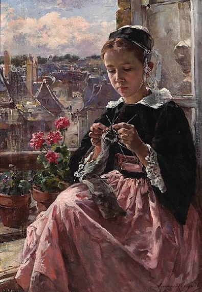 En effet, après s’être consacrée aux portraits de personnalités françaises au début de sa carrière, Marie Aimée Lucas-Robiquet se dirige vers de nouveaux horizons avec le mouvement orientaliste entre 1891 à 1909 avant de prendre avant un nouveau tournant artistique, le dernier, où la peinture de genre française et bretonne est au centre de son travail. Dans Jeune fille bretonne tricotant à la fenêtre, l’artiste fige l’activité de la jeune fille avec finesse dans une touche picturale proche de l’impressionnisme. Avec une attention particulière pour le paysage en arrière-plan et un travail minutieux du drapé du vêtement, elle compose un tableau réaliste dans la mouvance des préoccupations artistiques de l’époque.