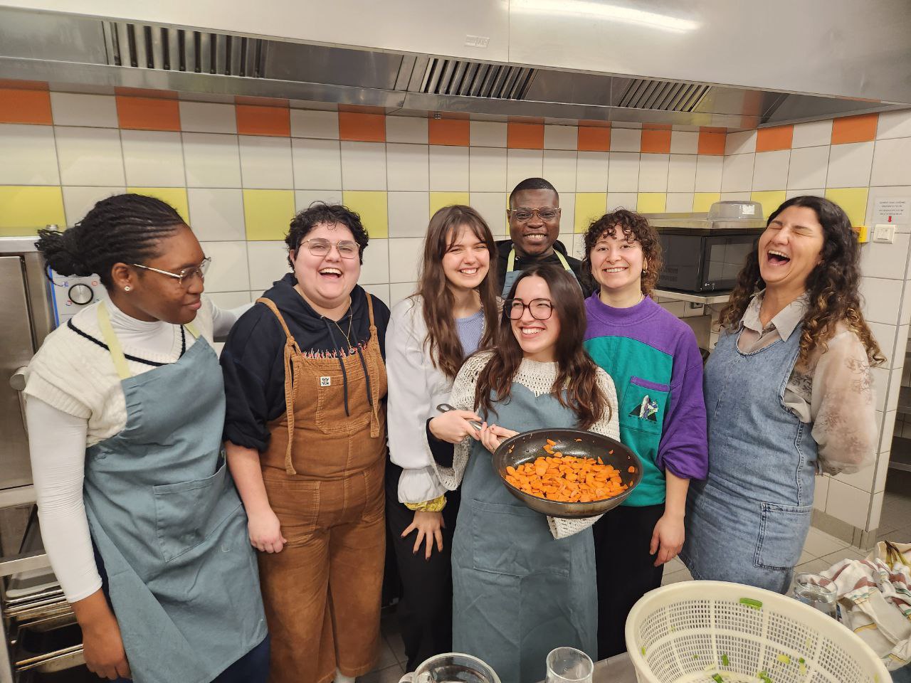 Venues pour différentes raisons, les personnes apprennent à se connaître et rient tout en s’affairant à la préparation. Certains binômes coupent les légumes, comme Yasmin, étudiante allemande arrivée en France depuis un mois. Elle s’est portée volontaire à la dernière minute alors qu’elle attendait la distribution alimentaire du mardi. « Je n’ai pas encore beaucoup d’épices chez moi et je peux profiter du matériel de la cuisine », sourit-elle. Djodaye, lui, est étudiant en troisième année de communication. Bénévole à l’épicerie depuis septembre 2025, il a connu l’initiative grâce au Discord de l’association. « C’est l’occasion de voir de nouvelles têtes et d’apprendre à cuisiner », explique-t-il. « Je cuisinais avant, mais beaucoup moins depuis que je suis arrivé en France. Je ne sais pas comment cuisiner la plupart des produits français, comme les poireaux et les champignons. L’atelier va me l’apprendre. »
