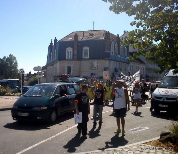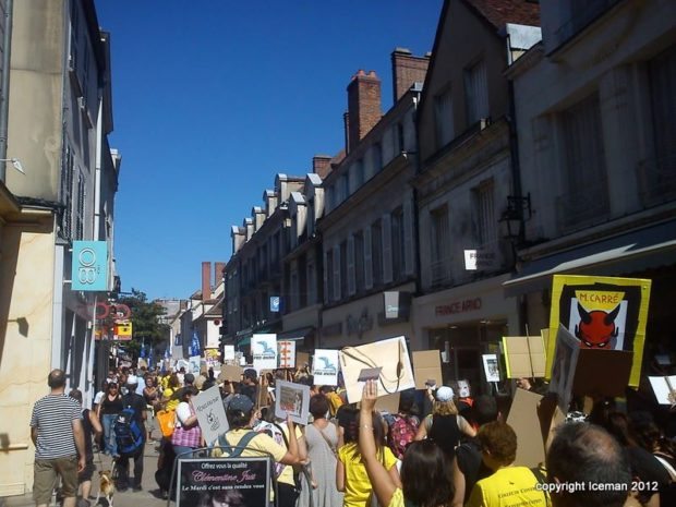 À 14 heures, avec l’aide de la police municipale qui encadrait la circulation, le cortège s’est ébranlé aux cris de « Mezilles Collabo des Labos » et autres « Libération Animale ». Serpentant dans les rues piétonnes sous le regard mi-étonné mi-réjoui des badauds, la manifestation a rejoint le parvis de la préfecture pour tenter d’obtenir une entrevue avec le représentant de la République. Vers 16h, tandis que les compagnons à quatre pattes des militants se désaltéraient aux fontaines, l’entrevue était confirmée. L’attente fut meublée par des discours et des considérations autour de l’actualité qui était sur toutes les bouches : le transport d’animaux de contrebande par Air France KLM. Rumeur, fait avéré ? Une certitude selon les membres de l’association ALARM.