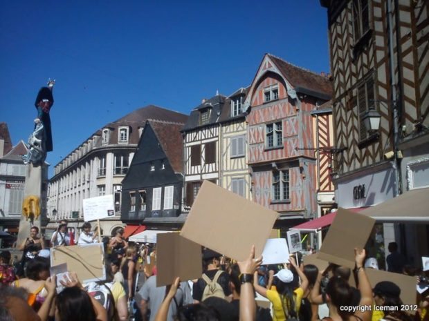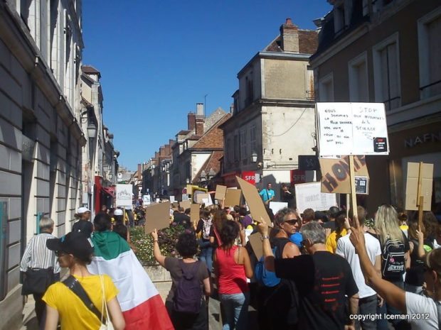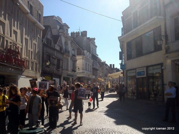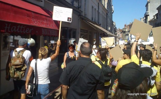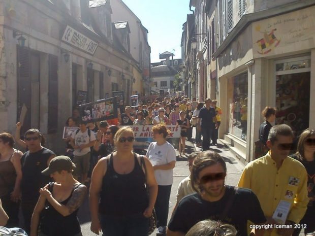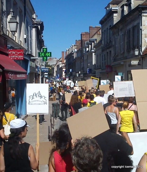 Deux points méritent d’être notés. D’une part, la forte présence de la gent féminine, une constante semble-t-il dans les manifestations de ce type. D’autre part, la cohésion entre les différentes associations membres du collectif : Fondation Brigitte Bardot, L214, Respectons, Animaux en Péril, Lévriers sans Frontières, Sea Shepherd, Pro Anima. Chacune disposait d’un stand sur la Place de l’Arquebuse en périphérie du coeur historique d’Auxerre. Chacune a pu s’exprimer au travers d’un mégaphone et d’une sono quelque peu défaillante…
