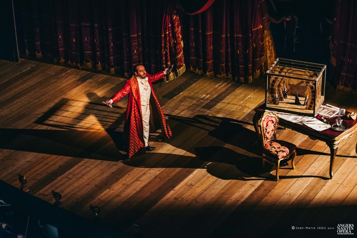 Dès le lever de rideau, la première émotion est créée par la beauté du décor aux touches dorées et aux drapés cramoisis. Il est en parfaite adéquation avec l’esthétique du théâtre à l’italienne de Rennes. Il semble que, Waut Koeken, le metteur en scène, ait eu la préoccupation de placer un second théâtre sur scène. Le jeu va plus loin, puisque lors du premier tableau, sur le bureau du roi, un des objets de décoration est une représentation du décor du troisième acte, comme s’il voulait déjà nous annoncer l’évolution de l’intrigue.