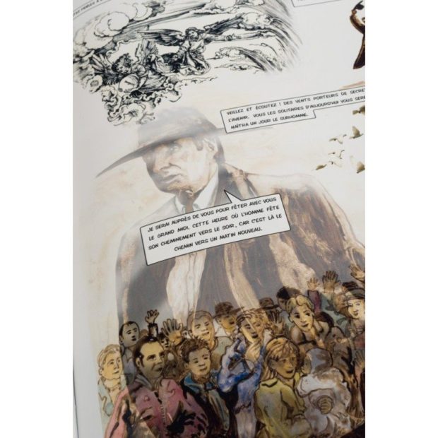 pierre-heber-suffrin-zarathoustra-nietzsche-bdAprès deux ans de travail, le premier tome de l’œuvre majeure de Nietzsche sort enfin. La BD est très fidèle au texte initial du philosophe dans la traduction de Hans Hildenbrand (Kimé, 2012). On suit Zarathoustra – le nouveau prophète d’un dieu unique – dans sa quête, ses rencontres et ses réflexions. Première surprise : là où on s’attendrait à une représentation du genre enturbanné et en tunique (comme on imagine les hommes de l’époque), on découvre un Zarathoustra au look d’Indiana Jones avec son chapeau ! Il tente de prêcher dans une ville à l’allure stambouliote, traverse des paysages évocateurs du Far West, du Japon, ou de l’île de Pâques. Il croise des « bouffons solennels » qu’on identifie sans peine. On reconnaît le Discobole, un archer assyrien, Vinci, Wagner, Hopper, Rubens, Botticelli… Bonne idée : pour chacun des thèmes abordés, une « chouette » philosophe donne un éclairage pédagogique bienvenu qui délivre des clefs pour une meilleure compréhension de cette pensée originale et poétique. « Vouloir libère », certes. Reste qu’il faut une bonne dose de volonté pour décrypter le message de Nietzsche ! Comme les textes sacrés, il est tellement alambiqué qu’on peut l’interpréter à sa guise. N’est-ce-pas, Adolf ?