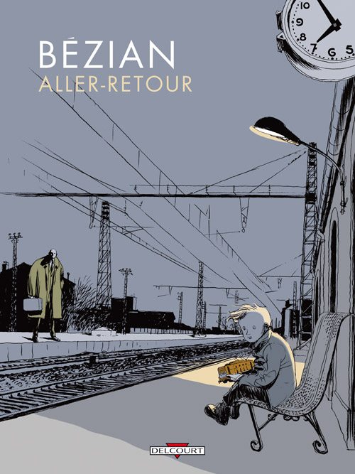 Une grande silhouette massive et molle perdue dans un imper vert olive, une petite tête blafarde dans les secousses bleuâtres d’un TER, une évocation de musique et de sons : les premières pages d’Aller-retour déconcertent un peu. Elles sont cependant à l’image de cet album relativement austère, presque intégralement dessiné en noir et blanc.