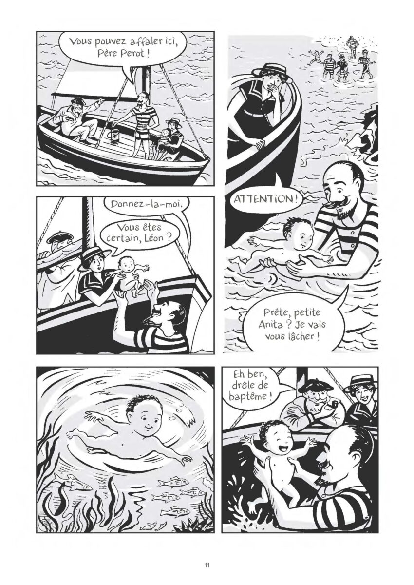 On aime le dessin identifié de Catel, son encrage, ses formes arrondies et douces. Cette fois-ci le défi était de dessiner la mer, la pêche sous l’oeil vigilant, avisé et critique, d’anciens patrons de pêche fécampois notamment. Seule entorse au dessin habituel, l’évocation des photos prises par Anita Conti, dont les célèbres portraits de Eugéne Recher, ou les scènes de pêche sur les ponts de navire chahutés par la tempête: le stylo et les traits fins remplacent les aplats noirs et ronds.