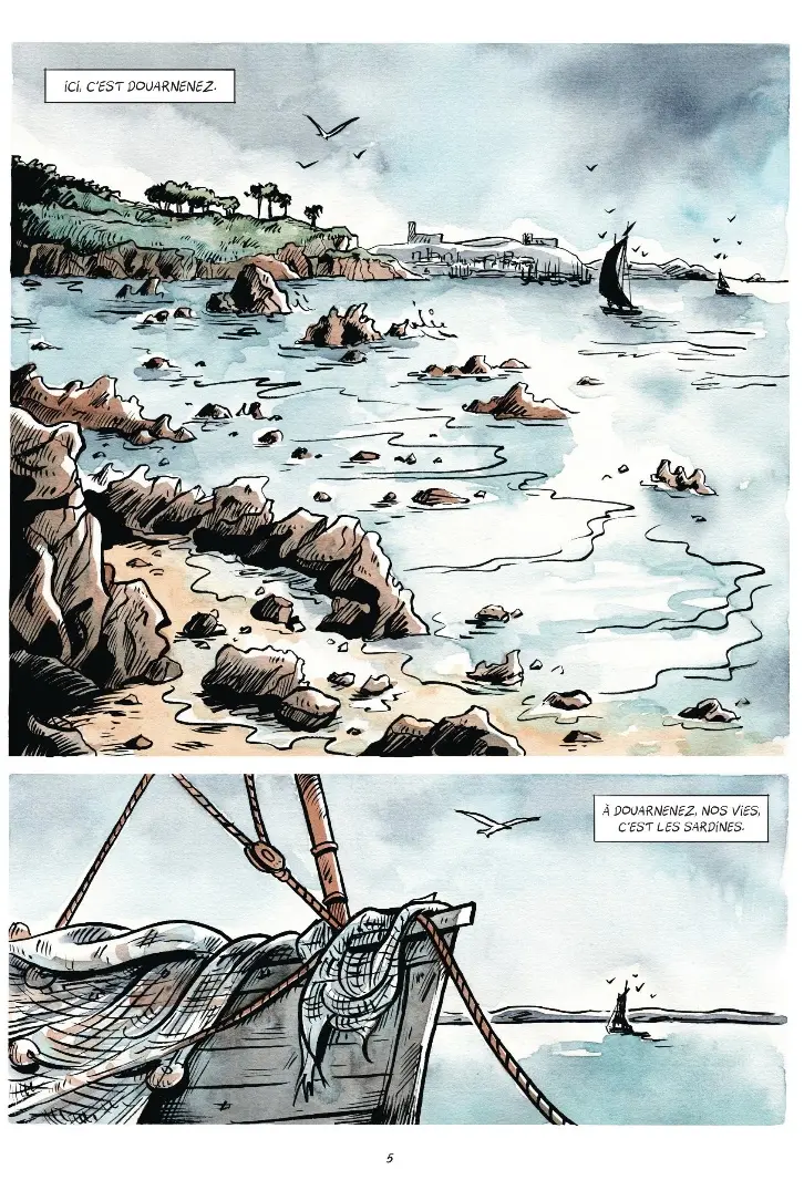 Le trait reste lisible, clair, jamais surchargé, ce qui permet aux scènes de groupe de rester compréhensibles. On sent le souci documentaire. On reconnaît les ateliers, la position des femmes devant les tables, le geste répétitif, la chaîne complète qui va du débarquement de la sardine à la boîte métallique. Quelques planches de foule restituent très bien la sensation d’un port à l’arrêt, d’une ville qui ne tourne plus. L’iconographie est en outre servie par un détail utile, le petit lexique de breton en fin d’album. Cette attention au langage localise le récit sans l’enfermer dans un régionalisme radical tel que le promeut actuellement le Conseil régional de Bretagne.