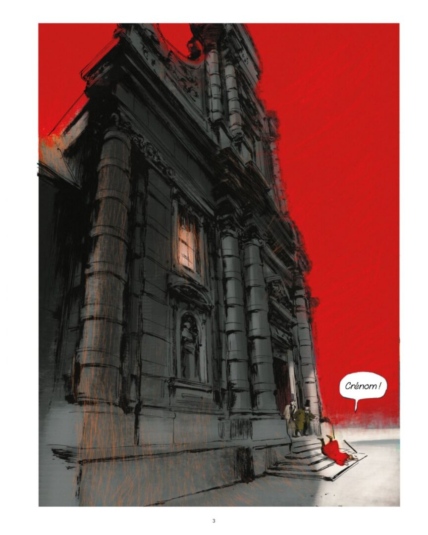 On était donc curieux de connaître son adaptation en images, exercice prolongeant souvent la vie des romans de l’ancien auteur de BD qui acceptait volontiers de confier ses récits à des dessinateurs auxquels il laissait toute latitude. Il fallait bien être deux pour relever ce défi en trois volumes. Tino et Dominique Gelli se sont donc attelés à la tâche avec pour ce dernier un goût de revoyure. Dominique avait en effet adapté notamment le sinistre et morbide Mangez le si vous voulez (Delcourt), Bd presque monochrome envahie par le noir du thème et du dessin (voir chronique). Avec Crénom Baudelaire, à l’inverse, Dominique Gelli fait cette fois-ci exploser les couleurs somptueuses, le rouge sang des manteaux, des robes, des drapeaux assurant le fil conducteur de cases inoubliables.