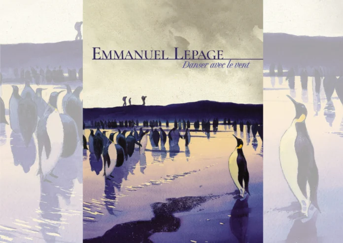 La silhouette de ce manchot sur la couverture de la BD, le bec tourné vers le ciel, nous rappelle une image. Pour les amateurs de dédicaces, elle est la signature fréquente sur la page de garde des ouvrages d’Emmanuel Lepage. Pour les lectrices et lecteurs, elle évoque son livre édité en 2011, Voyage aux îles de la désolation (Futuropolis). L’auteur y racontait son voyage de plusieurs semaines sur le Marion Dufresne vers les Terres Australes et Antarctiques Françaises. Pourtant Danser avec le vent est bien un nouveau voyage, une nouvelle histoire, surtout pas une nouvelle « aventure ». Il y a quinze ans, Emmanuel Lepage n’était resté sur place que quelques jours après cinq semaines de traversée. Aussi lorsqu’on lui propose en 2022 de repartir, pour un mois sur terre, il reprend son sac à dos et sa boite de pinceaux, attiré par le fait de partager la vie des femmes et des hommes confinés volontairement sur ces îlots du bout du monde. Ces trois silhouettes qui se profilent à l’horizon, sur la crête violacée d’une montagne, vont cette fois-ci occuper prioritairement le dessinateur breton. Les expériences scientifiques, les conditions matérielles ne sont plus l’essentiel. L’important ce sont désormais ces femmes et ces hommes qu’il va côtoyer, écouter pour tenter de comprendre les motivations qui les pousse à partir loin de leur quotidien et vivre avec des compagnons qu’ils ou elles n’ont pas choisi.