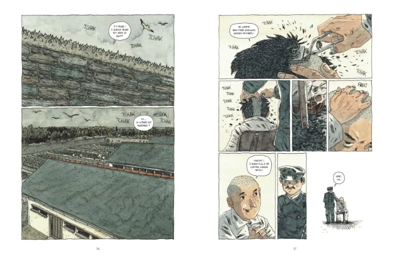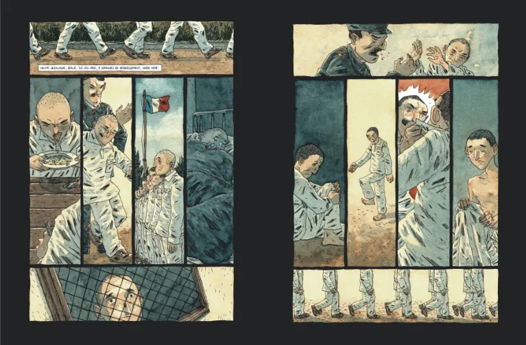 Les poings serrés d’indignation tout au long de la lecture des 120 pages de l’album, on suit le parcours de deux gamins qui ont pour défaut majeur d’être privés de cellules familiales stables et de ne pas répondre aux critères sociaux de la bourgeoisie de l’époque. Julien Hillion connait parfaitement ce quotidien puisqu’il publiait en 2022 Le bataillon des nuisibles (Jadis Editions) qui narrait l’histoire des trente premières années d’existence de la colonie pénitentiaire de Belle-Île-en-Mer. Son scénario de BD implacable et terrifiant révèle combien la société de l’époque était d’une violence totale à l’égard de la jeunesse « mal née ».