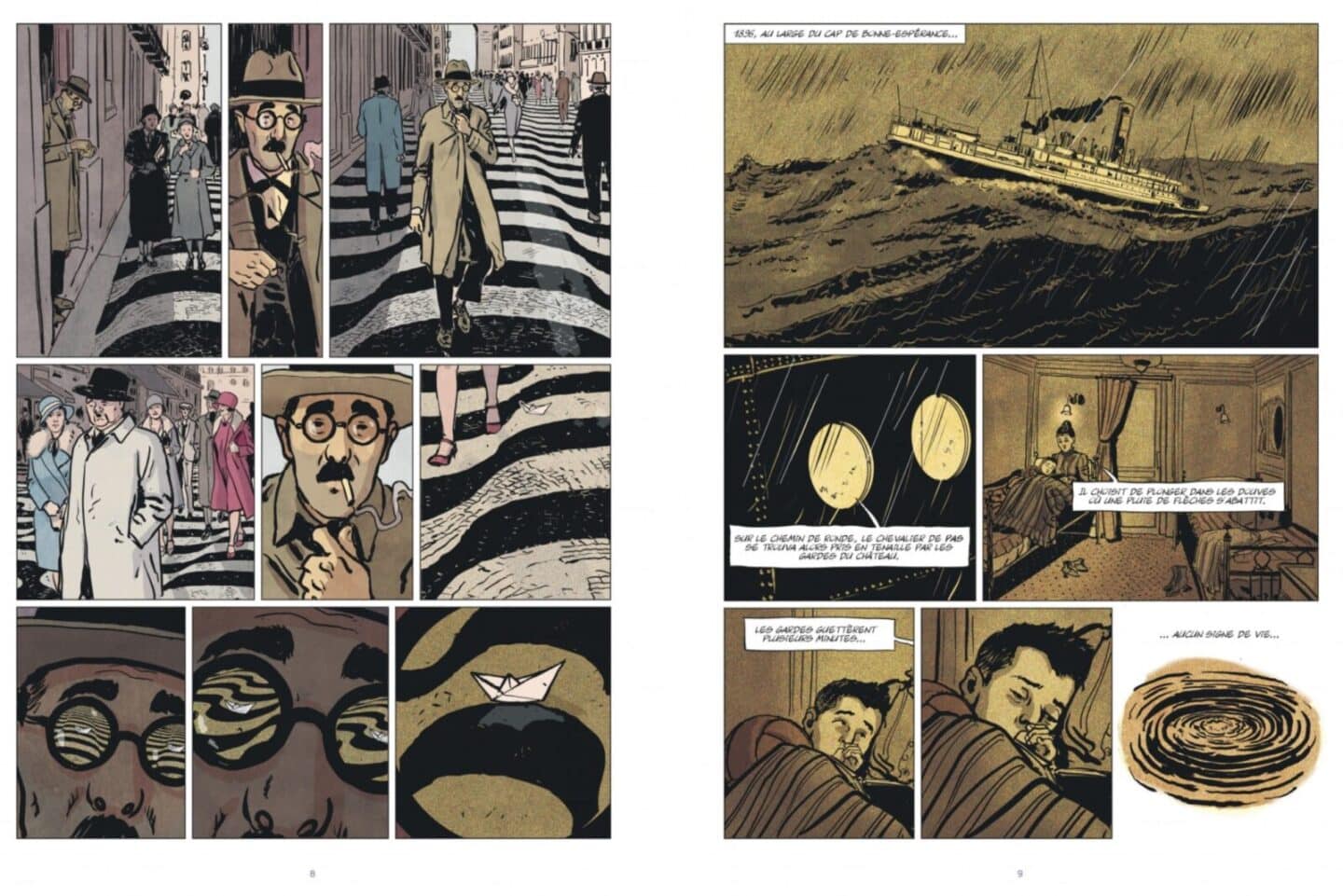 Même dans cet univers de la création, comme pour se protéger Pessoa va se dissimuler derrière des hétéronymes, Alberto Caiero, Ricardo Reis, Alvaro de Campos et d’autres encore, qui vont prendre corps et visages dans les cases dessinées. Des usurpateurs protecteurs. Il faudra quand même des mots pour dire cette difficulté d’être. Ce sont ceux de Pessoa enfant qui nous éclairent: « je suis né sans carapace, chaque émotion est comme une allumette grattée sur le tissu sensible de mon coeur, une aubaine pour le poète auquel cette infirmité confère le don de voir par dessus les choses ». Voir ce que les autres ne voient pas, c’est aussi ce que proposent les dessins de Nicolas Barral, qui métaphoriquement nous montrent ce que le regard vide de Pessoa perçoit seul. L’intranquille dit le titre de la BD, cet état qui veut signifier le contraire de l’agitation mais qui n’est pourtant pas celui de la sérénité. L’ouvrage nous aide à nous faire une perception de cette intranquillité, dont le Journal publié pour la première fois en 1982 deviendra, de manière posthume, l’oeuvre majeure de l’écrivain portugais, regroupant pensées, réflexions, aphorismes consignés par Pessoa entre 1913 (Pessoa a 25 ans) et 1935.