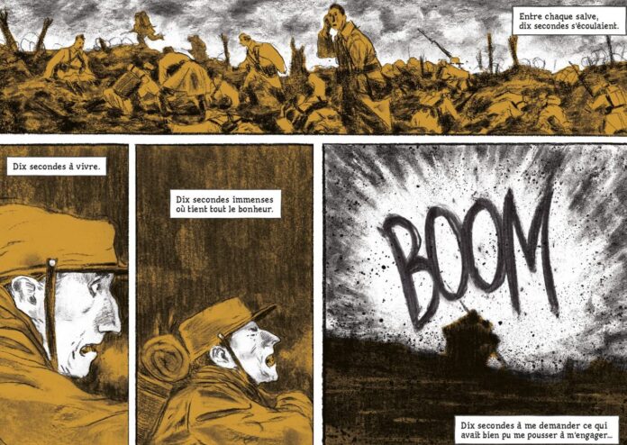 Peut-être fallait-il un dessinateur argentin pour oser relever ce défi ? Facundo Percio le fait avec un rare talent. C’est son style si personnel qui frappe le lecteur dès les premières pages, une bichromie saisissante qui ramène le monde à l’essentiel. Ce marron moutarde colle à la lecture comme la boue aux chaussures des poilus. Flouté, il masque les horreurs, évite l’indicible, l’immontrable, dessine le silence, peut-être mortel, qui précède l’explosion de l’obus.
