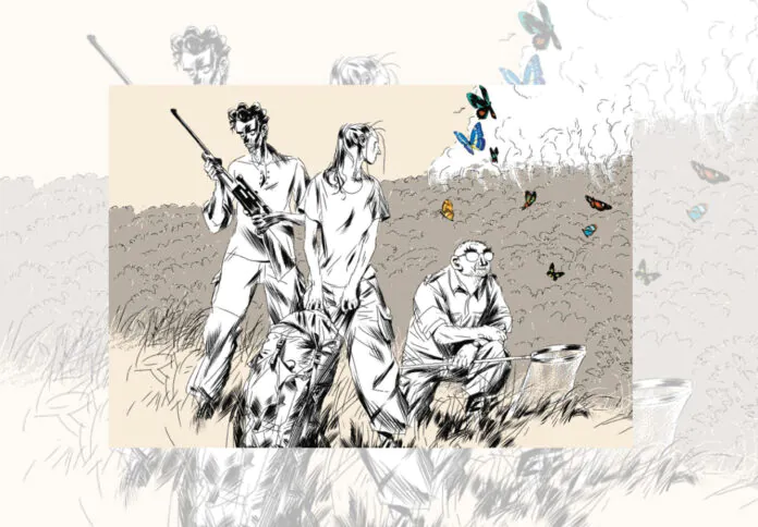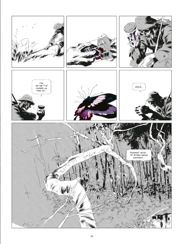 Les pages défilant, la poésie que renvoient les vols des papillons se heurte alors rapidement au réalisme économique et à des gangsters désireux de ne pas voir leurs projets de déforestation brisés par un simple lépidoptère. Ces bandits sont bien entendu dans la forêt, menaçant et tuant les indiens, mais ils sont plus sûrement dans des bureaux de verre, dont la froideur tranche avec la beauté amazonienne magnifiée par des fonds tramés et les traits aux mille nuances de gris de Bézian. Cette quasi monochromie, rompue par les seules couleurs des papillons, efface peu à peu le caractère contemporain de l’aventure de Camille et Géraldine pour leur donner des allures d’explorateurs du XIX ème siècle. Le récit entomologiste s’est transformé en thriller politique et écologique avec ses rebondissements, son histoire d’amour et ses clins d’oeil à l’actualité.