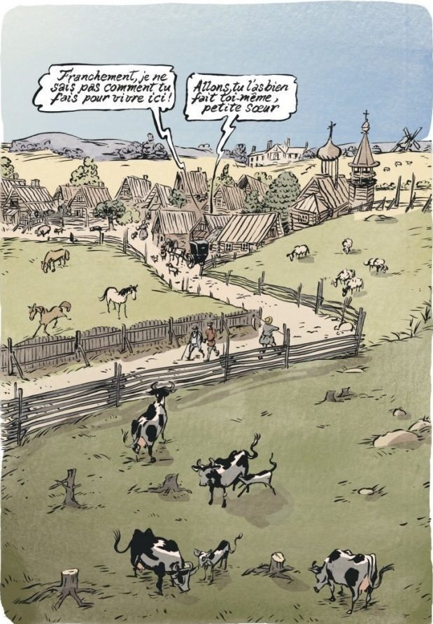Durant un an, Martin Veyron s’est en effet consacré à la lecture des auteurs russes et a déniché au cours de ses pérégrinations intellectuelles cette pépite qui jamais n’a semblé autant d’actualité. Dès les premières pages, dans un dialogue éclairant entre deux sœurs l’enjeu du récit est connu : la première s’est mariée à la ville avec un homme riche et entreprenant et se réjouit de ne plus côtoyer les animaux tout en se vêtant des plus beaux tissus. La seconde, mariée à Pacôme, restée à la campagne se satisfait de ce qu’elle possède et se réjouit d’une vie riche en sentiments qui lui suffit.