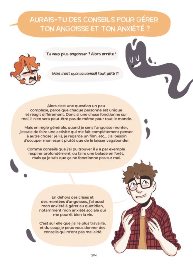 Enfin, l’auteur finit sa bande dessinée par une « Foire aux questions de l’Angoisse », où il propose plusieurs conseils pour gérer son angoisse et son anxiété, sur comment demander de l’aide mais aussi comment s’écouter lors des crises. Accompagnées d’illustrations de Clément et d’Angst, ces quelques pages de conseils permettent aux lecteurs de pouvoir appréhender leur mal-être de manière plus tranquille. Sans transformer cette foire aux questions en un manuel médical et psychologique, Tacméla arrive, avec une petite touche d’humour, à donner des indications pour gérer son angoisse d’une manière ludique et divertissante.