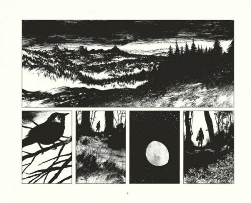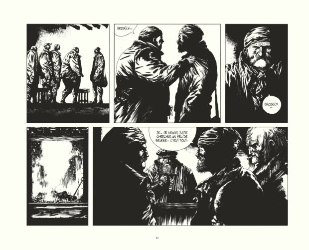 C’est une BD en noir et blanc. Blanc comme la neige qui enveloppe les paysages d’un pays de l’est de l’Europe. Blanc comme la feuille d’un rapport que doit écrire Brodeck à la demande des habitants du village. Blanc comme le ciel au-dessus de la tête de Brodeck enfant, après le passage de la guerre. Mais noir aussi. Noir comme le silence des visages menaçants d’une communauté pleine de mystères et de haine. Noir comme l’encre de la plume de Brodeck, chargée de transcrire la mémoire aménagée d’un crime. Noir comme les traits dans le ciel au-dessus de la tête de Brodeck enfant, signes du malheur.