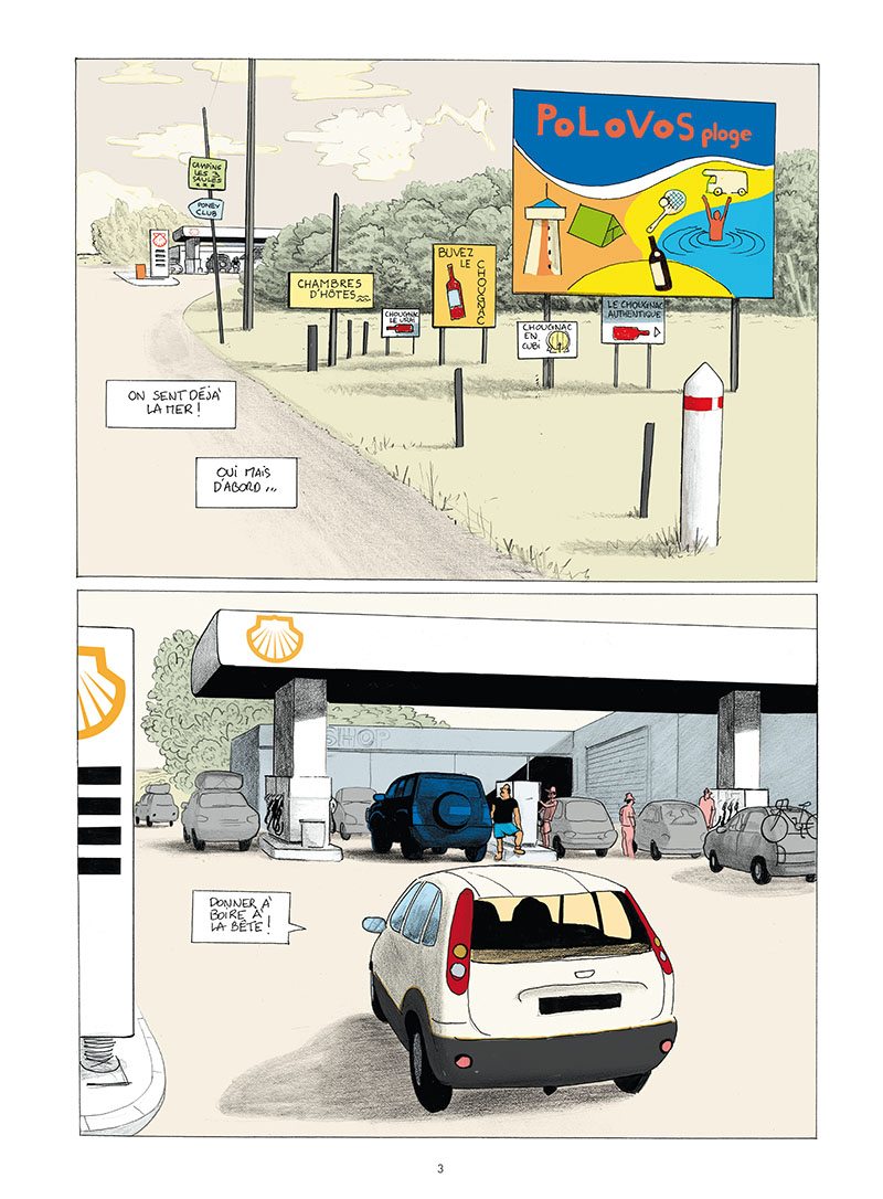 La France et ses finances, ses équilibres budgétaires et le respect du traité de Maastricht ont eu beaucoup de chance ! Les éditions Futuropolis ont eu la lumineuse idée de publier cette Bande dessinée APRÈS les vacances d’été. On n’ose imaginer la parution de ce livre en juin avant la migration estivale sur les côtes et plages françaises. Tous les lecteurs, les millions de lecteurs auraient probablement annulé leurs réservations de campings, de logements, brusquement conscients des dangers que pouvaient générer deux ou trois semaines passées sur les côtes atlantique, méditerranéenne ou de la Manche. Ces risques encourus sont nombreux et Vive la marée ! en dresse un panorama complet. Mais les dangers de Rabaté et Prudhomme ne tuent pas, car ce sont ceux du ridicule. Le ridicule d’une bande de jeunes dragueurs impénitents abrités derrière leurs lunettes de soleil, la langue bien pendue, mais les fesses vissées sur leur serviette de plage. Celui de l’attente prolongée et coléreuse à la pompe d’une station-service. Ou encore des joies de la pêche à la crevette, de la promenade (aller-retour !), du chien. Pas de noyade ou d’accidents de voiture, de drames ou de suicides, mais des petites banalités qui tissent notre quotidien, celui des naturistes, des marchands de glace, des agitateurs de cerf-volant ou des commerçants saisonniers. Et même du lecteur dessiné en vieux sage ventripotent (les hommes sont souvent ventripotents, c’est bien connu) jetant un regard hautain et « cultivé » sur ces pauvres congénères, mais dont l’image se promenant sur la plage nous rappelle que lui aussi participe à cette comédie.