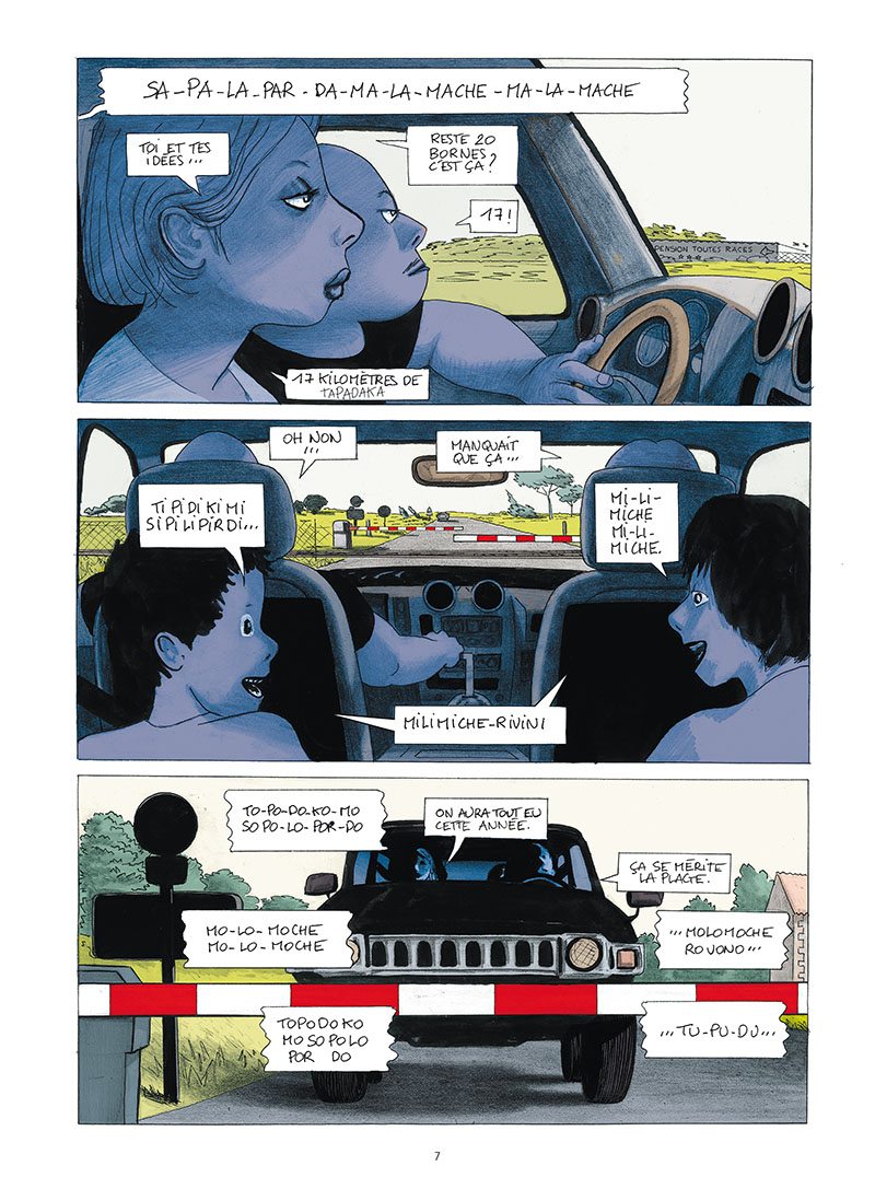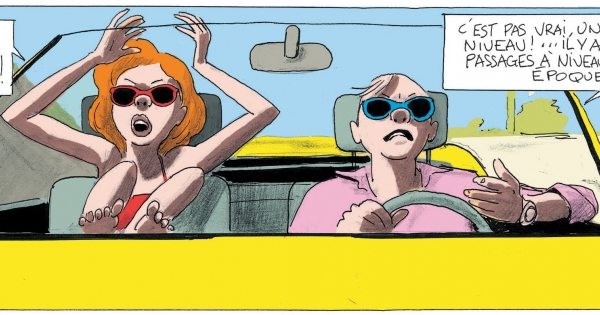 Le lecteur fidèle retrouve donc les repères de l’univers de Pascal Rabaté qu’il raconte depuis de nombreuses années dans ses BD ou dans ses films comme « Ni à vendre ni à louer » ou « Du goudron et des plumes ». Et la BD reprend même la technique cinématographique du travelling : le dessin se promène de lieux en lieux, de personnages en personnages, retrouvés souvent quelques pages plus loin, en premier plan ou en toile de fond. Avec les auteurs on marche mains dans le dos, observateur bienveillant de nos semblables. Et la caméra, ou plutôt le dessin, n’hésite pas à utiliser le zoom arrière pour détailler tous les occupants de véhicules bloqués dans un embouteillage ou pour figer dans un plan fixe une jeune femme complexée sous le regard inquisiteur d’une mouette. C’est peu dire que le dessin déborde lui aussi de tendresse et se passe parfois de dialogues pour prendre de la hauteur, celle d’un cerf-volant, ou décrire à merveille la gestuelle ridicule, mais juste d’un joueur de pétanque.