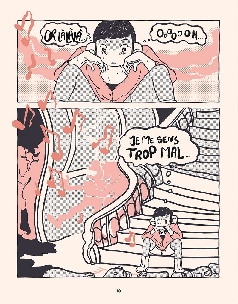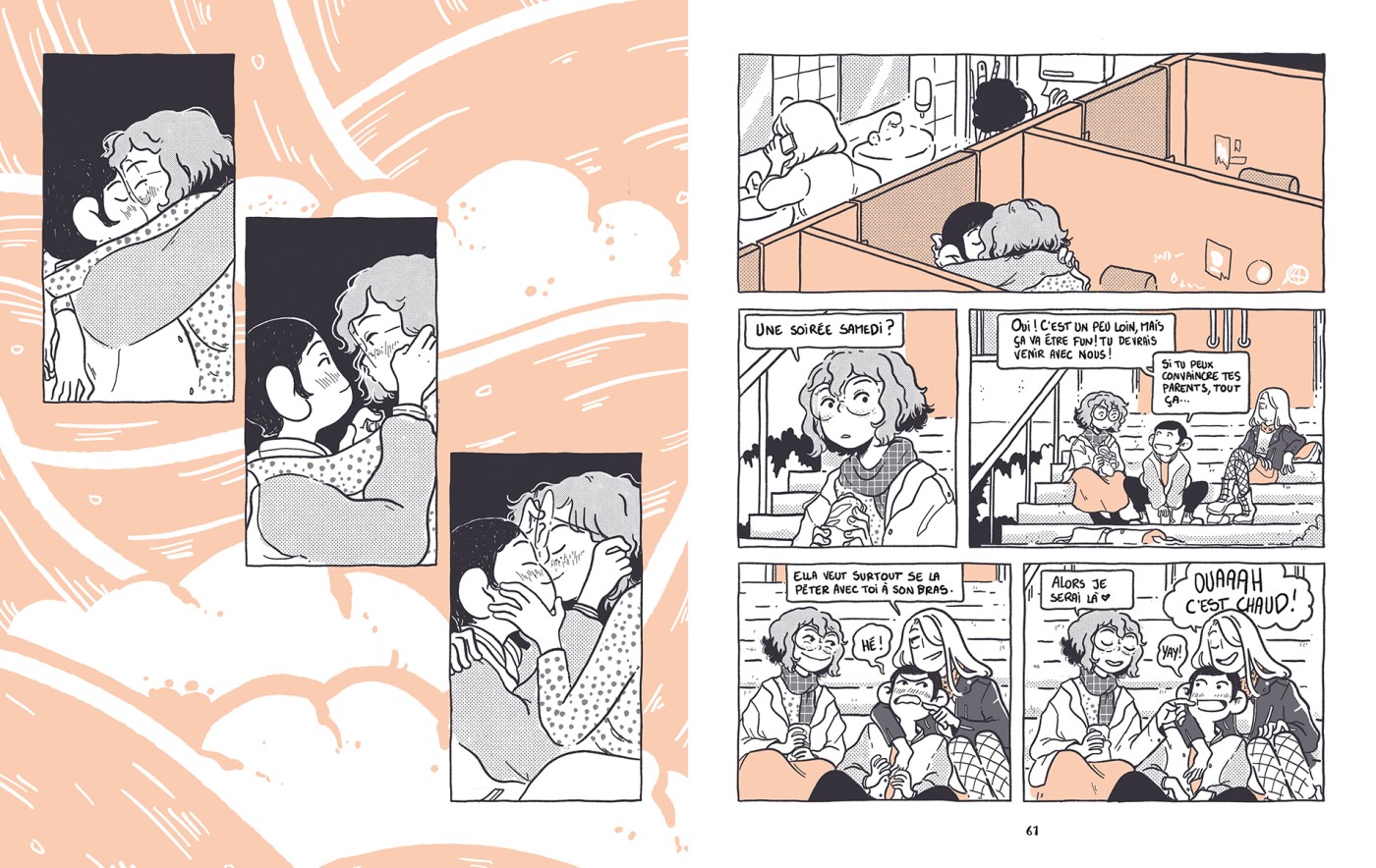 Comme les cases, qui mêlent souvent deux situations distinctes par le jeu de couleurs, on pénètre dans les soirées qui constituent une partie importante de la vie sociale des deux jeunes filles. Il ne manque que la musique poussée à fond pour faire vibrer encore plus les pages qui sentent le vécu. Et quand le sentiment devient plus fort, plus sombre, une pleine page magnifique s’installe comme pour briser le rythme, faire réfléchir, prendre le temps de poser ses sentiments un peu en vrac et de les examiner tranquillement. Les traits font parfois penser aux mangas, tamisés par des trames discrètes.