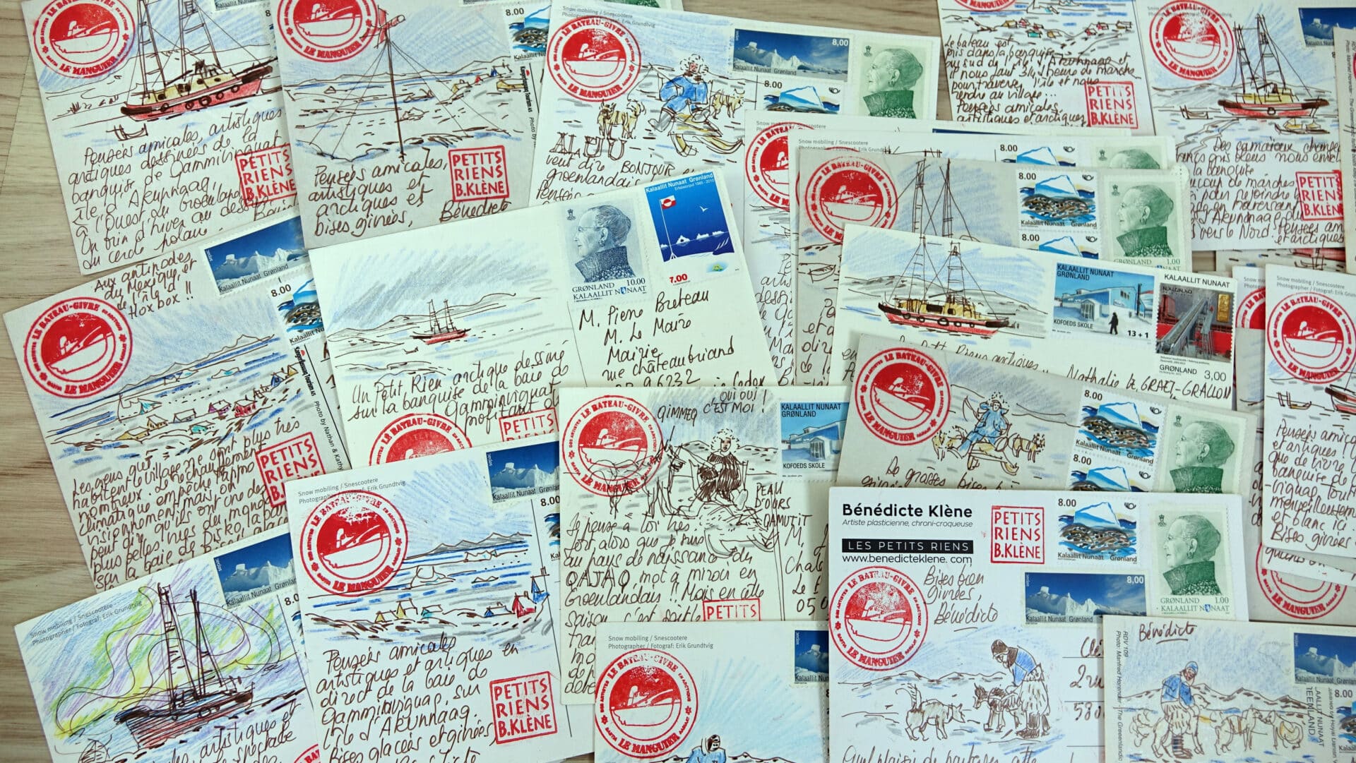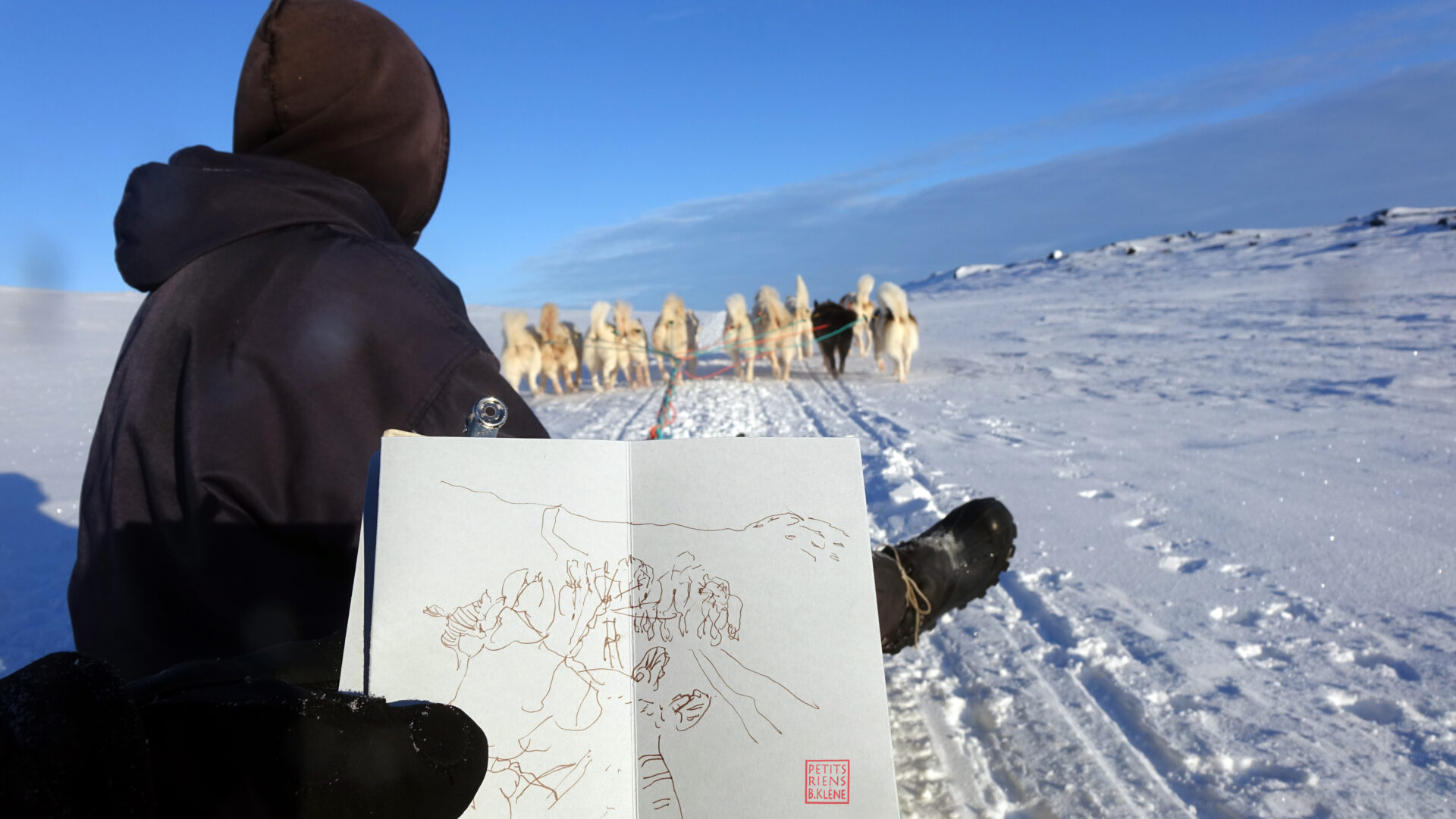 Bénédicte Klène : L’association Les amis du Manguier et Philippe Hercher n’imposent aucune production et ne demande pas de restitution aux artistes. Ils offrent la possibilité de développer un projet personnel et facilitent le processus au besoin. J’ai reçu le soutien matériel de Canson et Faber Castel pour la résidence, Philippe m’a accompagné et filmé, car je voulais réaliser une vidéo en remerciements. Il est allé voir Ferdinand, le musher (meneur de chiens, NDLR) et a facilité la communication entre nous.