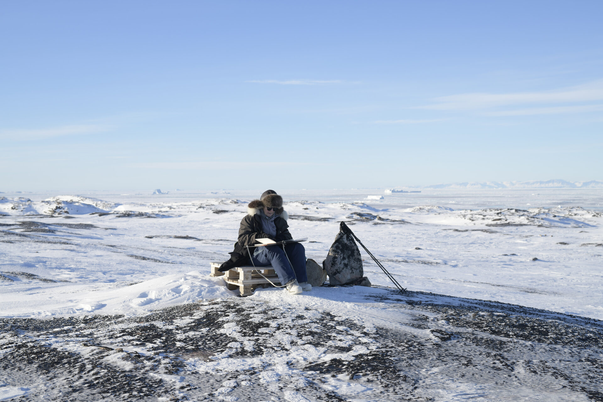 Je voulais dessiner des panoramas sur la banquise, mais le froid et le vent imposaient une préparation en amont. Pour le premier dessin que j’ai réalisé en extérieur, le 20 février, Philippe m’a aidé à préparer un petit traîneau sur lequel j’ai pu m’asseoir. Je m’étais préparé une boîte à dessiner et un tapis chauffant sur batterie afin de protéger mon papier et mes stylos sinon l’encre gelait en cinq minutes. Il avait préparé une peau de bœuf musqué, de façon à ce que je sois mieux protégée du froid. Ce n’est qu’avec tout ce dispositif qu’il m’a été possible de dessiner à l’extérieur avant de mettre en couleurs sur le bateau.