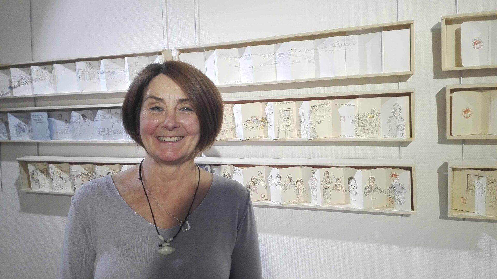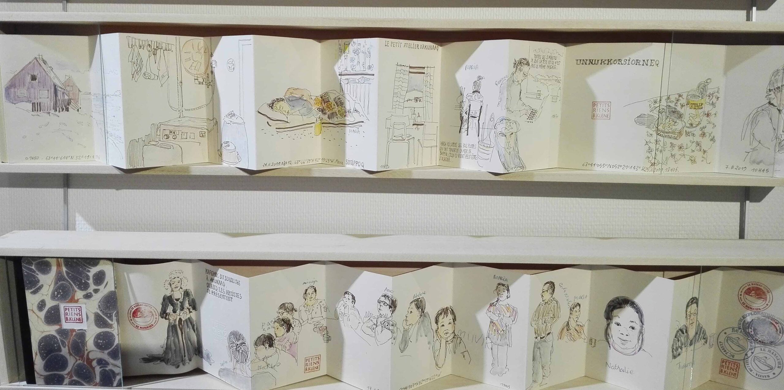 Bénédicte Klène : Mon protocole a légèrement changé. Je suis partie avec 60 m de papier préalablement coupés et pliés, soit 2 m de papier par jour. Ils n’ont été reliés qu’à mon retour en France. C’est pour cette raison que, faute de temps, certains ne sont pas reliés dans l’exposition Les petits riens du Groenland. Je travaille exclusivement avec du papier couleur crème habituellement, mais je voulais aussi travailler le blanc et le gris pour cette expérience. J’ai réalisé un grand panorama du Mont-Blanc un jour et le public n’assimilait pas forcément le fond beige à de la neige, ils pensaient à une vague (rires). Le gris devait servir aux intérieurs, mais finalement, je n’ai pas eu l’occasion d’en dessiner beaucoup. J’ai essayé de privilégier les portraits, dessiner les intérieurs m’intéressait également, mais il aurait fallu plus de temps. J’ai tenté d’intégrer les portraits dans un intérieur même s’il ne s’agit que de quelques lignes abstraites.
