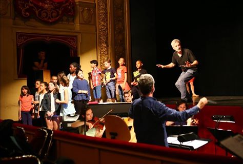 Mais pratiquement, comment les choses se sont-elles faites ? En premier lieu un long travail a été effectué avec des enfants de l’école Champion de Cicé. Ils ont regardé ce qu’était une salle d’opéra, ils ont approché les multiples métiers qui en font la magie et enfin ils ont appris à chanter les textes du Petit Ramoneur et à agir sur le plateau sous les ordres d’un metteur en scène. Ils s’en sont tirés comme de vrais professionnels ! Ils n’ont pas été les seuls, car à défaut d’être sur scène, d’autres enfants, répartis dans les cintres et dans les corbeilles avaient appris ces mêmes textes. Nous avons donc croisé 21 élèves représentant l’école Clothilde Gauthier de Rennes et 38 jeunes Vannetais représentant deux chorales des écoles Madame de Sévigné et Jules Simon. Notre maître de cérémonie Gildas Pungier, de l’ensemble Mélisme(s), baguette en main, a donc invité enfants et parents à une rapide initiation, il a opéré quelques réglages dans le plus joyeux chahut, et a accueilli sous les applaudissements les membres de l’orchestre, formé par des élèves du conservatoire à rayonnement régional de Rennes.
