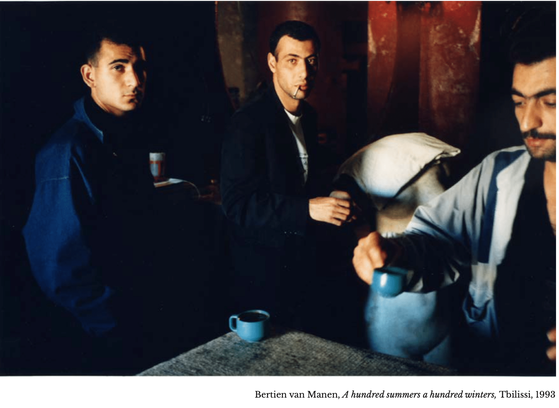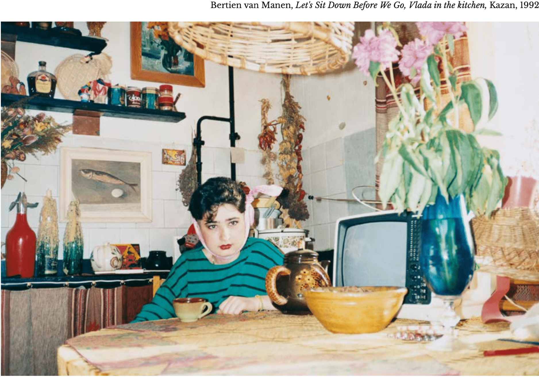 À partir des années 1990, Bertien van Manen se tourne vers l’Est : Ukraine, Russie, Géorgie, Kazakhstan, Moldavie… Son livre Let’s Sit Down Before We Go (2011) synthétise ces années de voyages à travers les espaces domestiques post-soviétiques. Ce sont des images feutrées, parfois mélancoliques, où le sofa, la nappe à fleurs, les murs à tapisserie deviennent les témoins d’une époque révolue. Il y a là du Tchekhov et du Tarkovski, mais vus à hauteur d’humanité, dans la lumière douce d’un matin de cuisine.