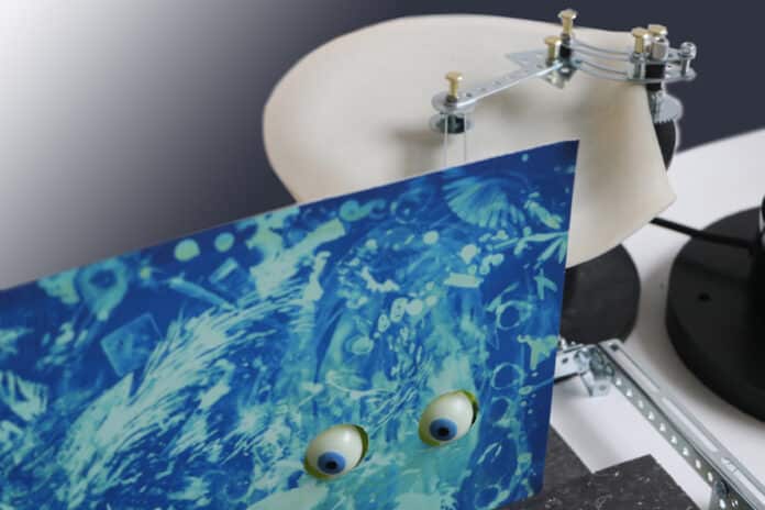 Comme une extraction, l’œuvre Scories Story émerge de ce monde analogique et met en évidence le process de camouflage, alors que deux petits globes oculaires scrutent lentement, par un mouvement continu de droite à gauche et de gauche à droite, l’ensemble de l’exposition. Des sculptures récentes prolongent selon l’artiste « l’exploration de la matérialité et des échelles inversées par des mécanismes discrets. Il est beaucoup question dans l’exposition de réversibilité, de diversité de points de vue, de circularité, de voyage entre les mondes, de fragments et d’effet aquatique, quasi cosmogonique, de féminismes et… de la communauté des Shakers. »