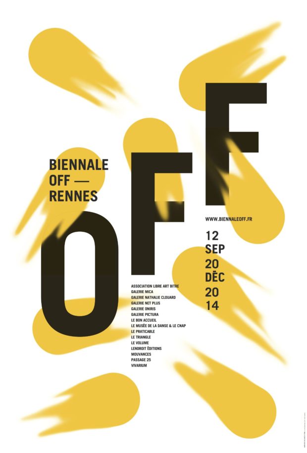 Biennale d’art contemporain de Rennes 2014 OFF. Expositions, conférences, performances, rencontres, du 12 septembre au 20 décembre 2014. Vernissage de la Biennale OFF le samedi 27 septembre à 18h30 à Lendroit éditions, 24 bis place du Colombier, Rennes.