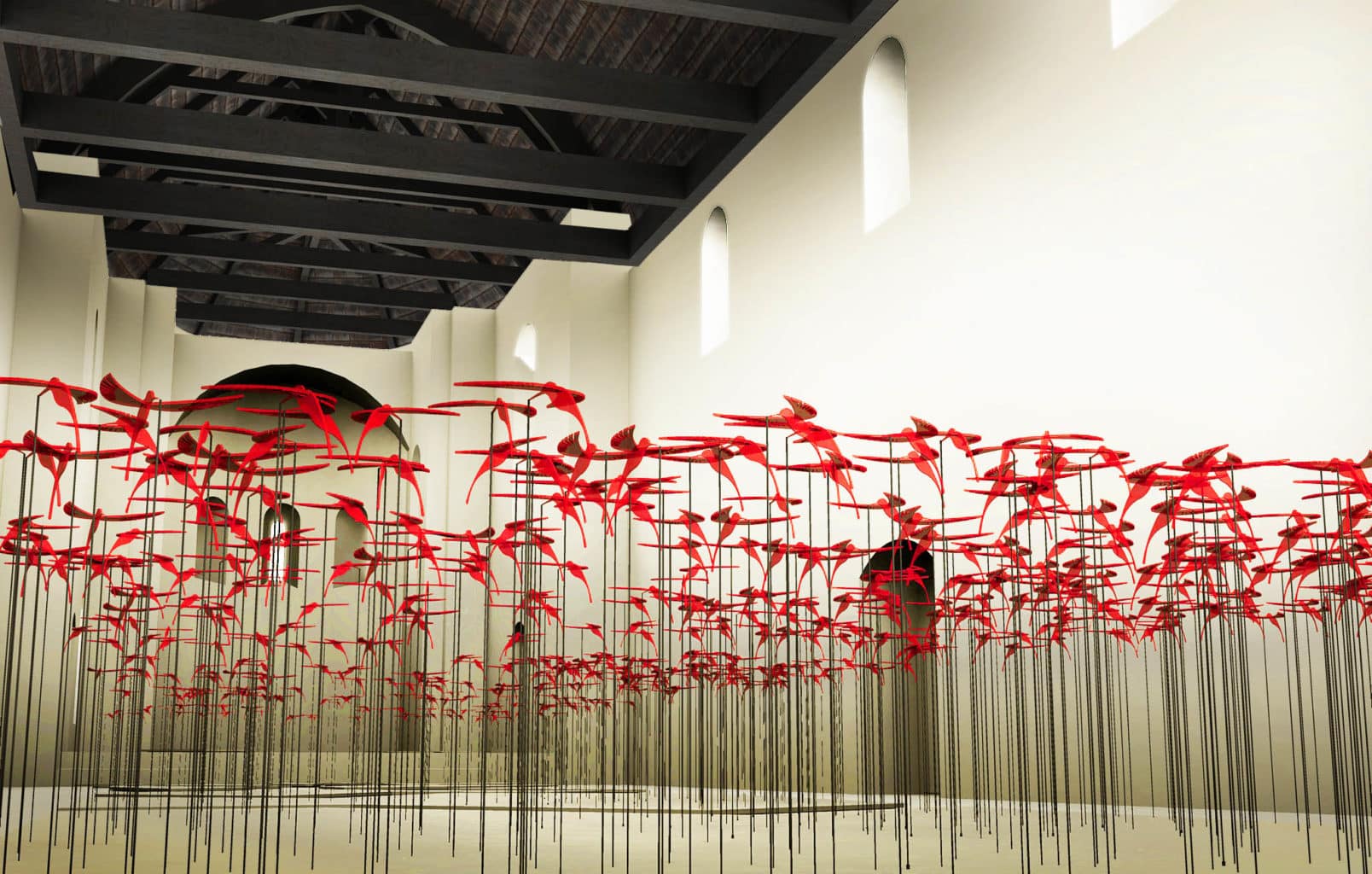 Fanny Bouchet et Emmanuelle Messier forment le duo BYME, une association créative fondée en 2013. Évoluant entre architecture, design et création artistique, le travail plastique des deux artistes est marqué par un processus de répétition à la recherche d’une perception différente de la réalité. Au cœur de la chapelle du centre d’art Les 3CHA, l’installation in situ Nuée, met en scène 500 colibris rouges suspendus par des tiges en acier. En écho à une légende amérindienne du colibri racontée par Pierre Rhabi (agriculteur, écrivain et penseur français), Fanny Bouchet et Emmanuelle Messier amènent le public à s’interroger sur le pouvoir de ses convictions profondes.