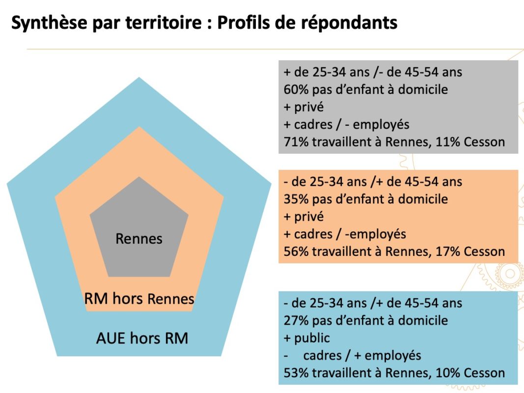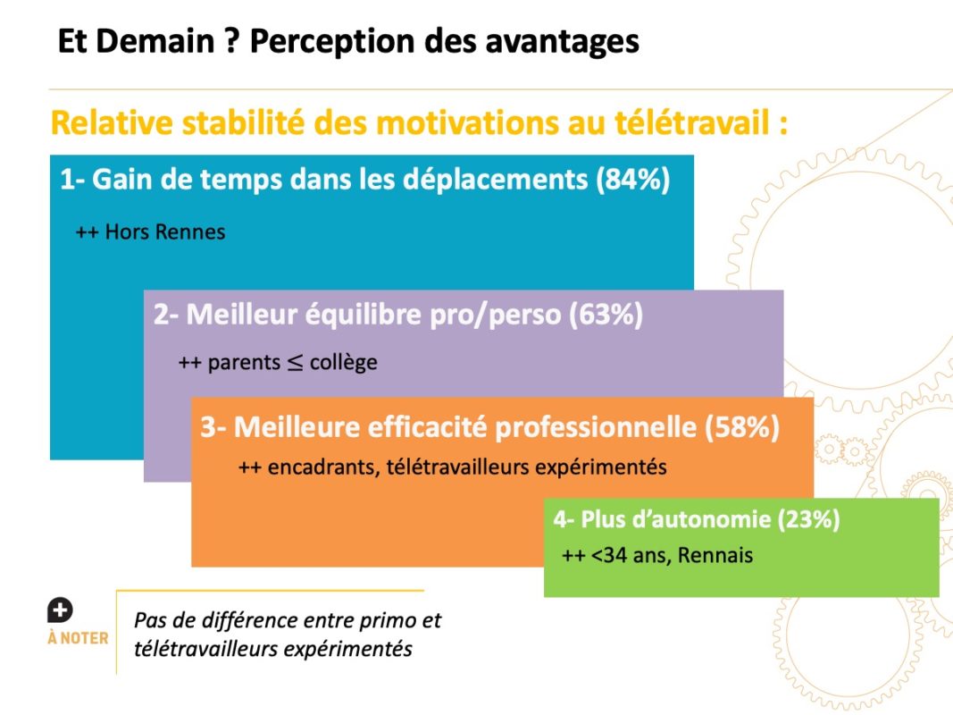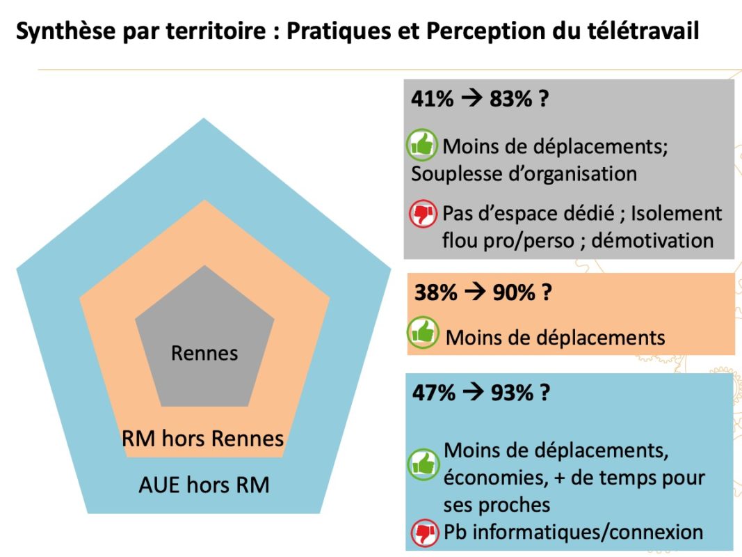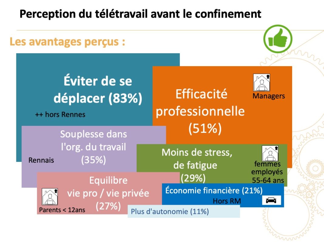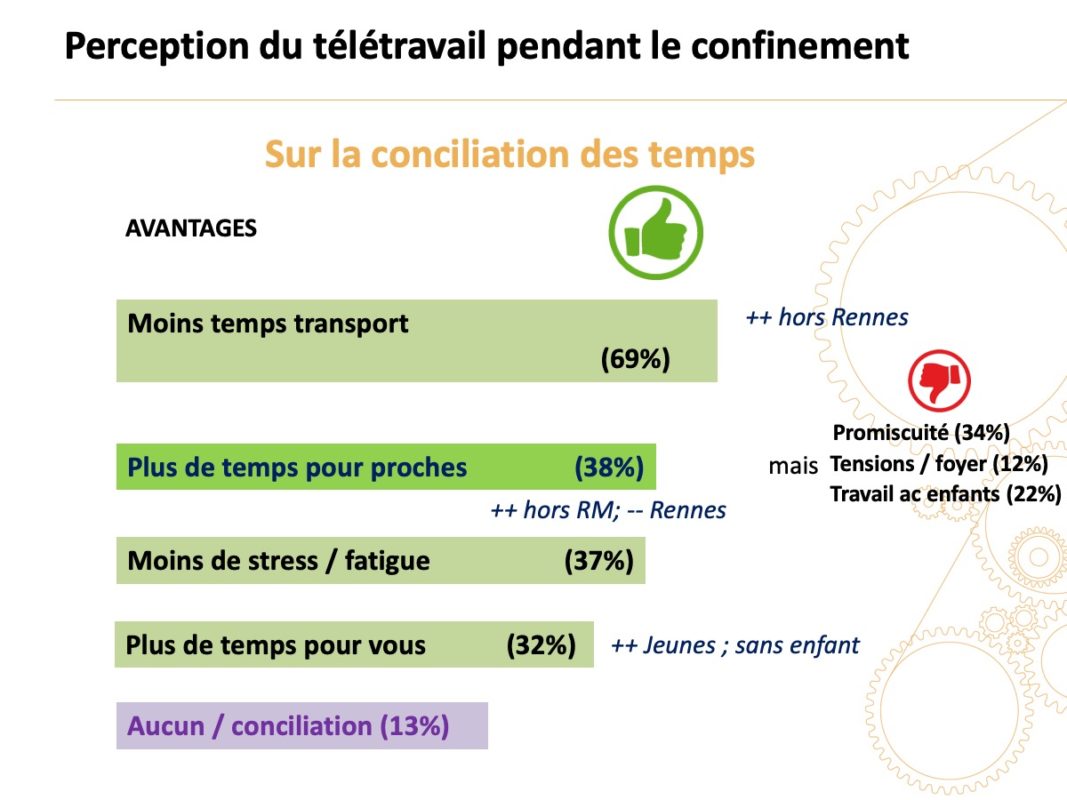 En matière de conciliation des temps, . Cet avantage est cité surtout par les habitants de l’AUE (Aire Urbaine Élargie) et de Rennes Métropole (respectivement 80 % et 75 %, plus qu’à Rennes 54 %). Il est lié au motif » moins de stress et fatigue « , lui aussi davantage cité par les habitants hors Rennes (40 % AUE, 38 % RM, 30 % Rennes) et par les employés, ainsi qu’au motif » avoir plus de temps pour ses proches » cité lui aussi davantage par les habitants hors Rennes.