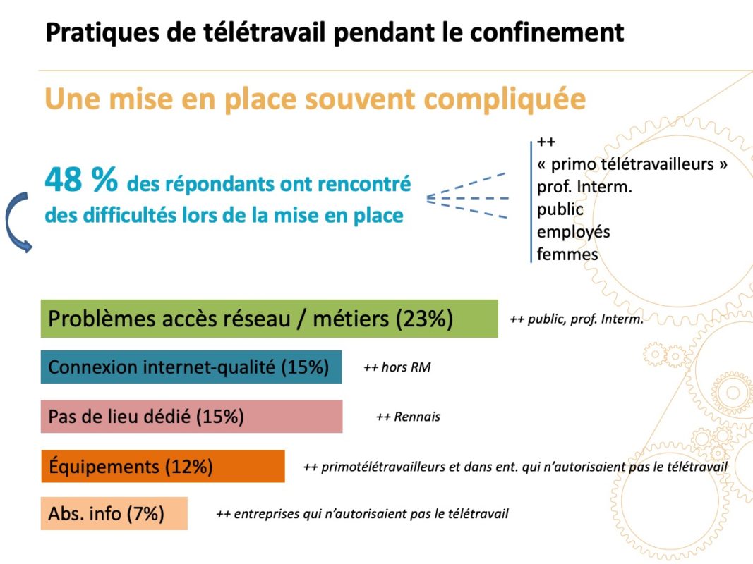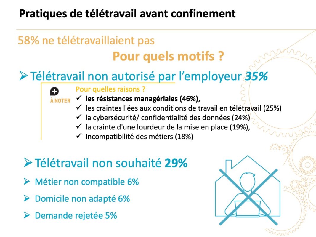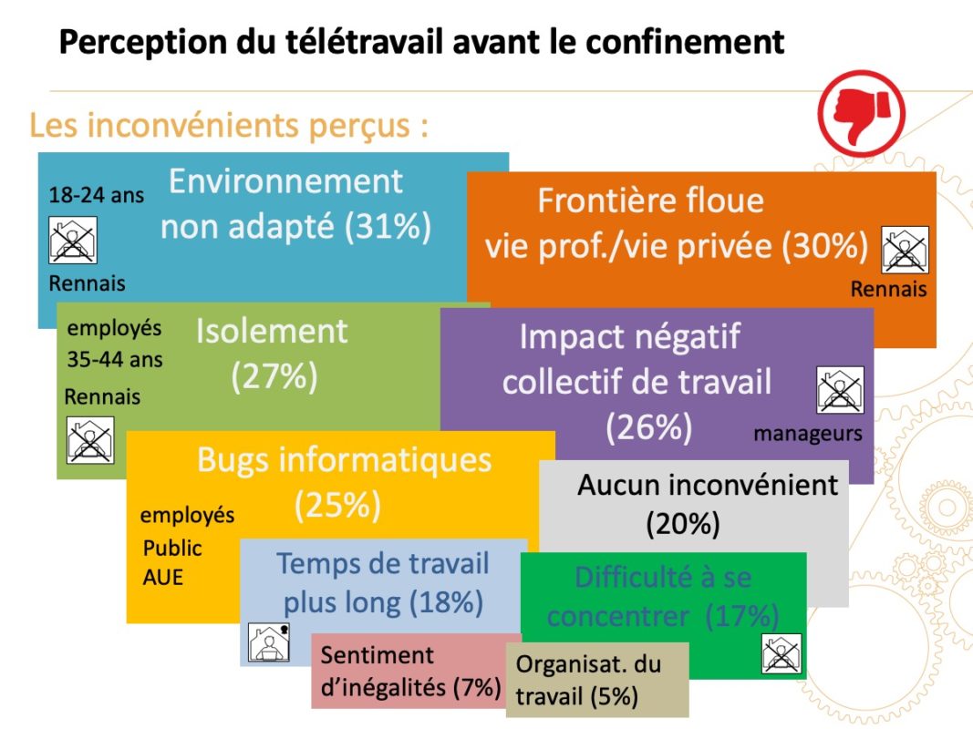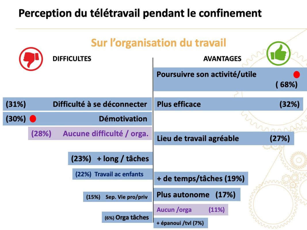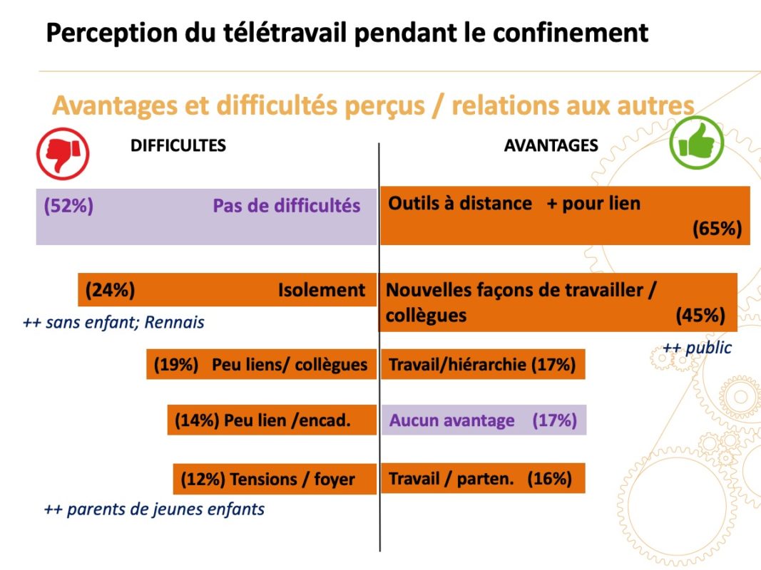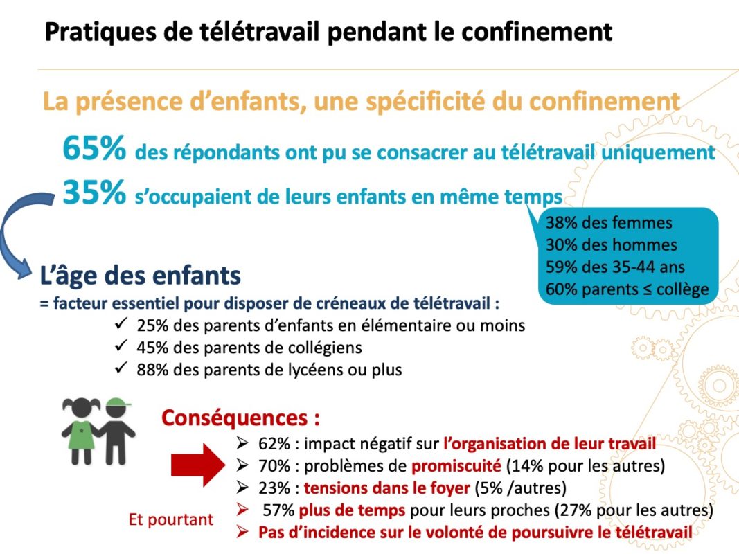 - Spécificité du confinement : 35 % devaient gérer leurs enfants en même temps qu’ils télétravaillaient
