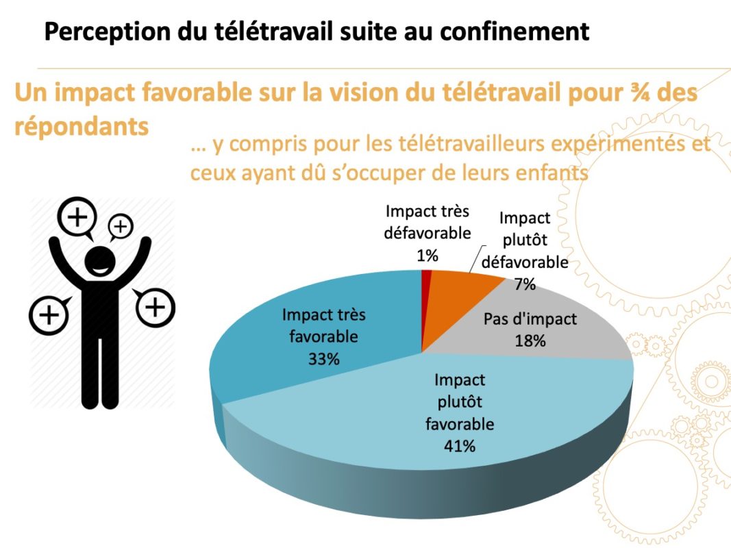 Globalement, pour 74 % des répondants, le télétravail contraint pendant le confinement a eu un impact favorable sur leur vision du télétravail (1/3 très favorable), pour 18 % il n’a pas eu d’impact et pour 8 % il a eu un impact défavorable.