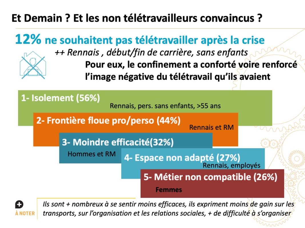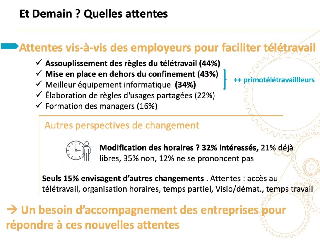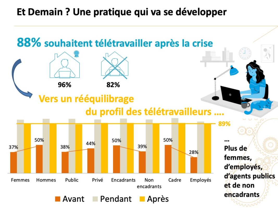 Parmi les répondants, 88 % souhaitent télétravailler après la crise, contre 42 % qui télétravaillaient avant, soit un quasi doublement. La proportion monte à 96 % parmi les télétravailleurs expérimentés, et 82 % des primo-télétravailleurs.