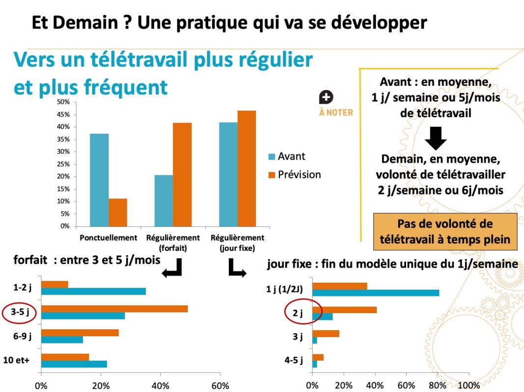 Il y a une réelle volonté de télétravailler de façon plus régulière au profit essentiellement du télétravail avec forfait, sans différence majeure entre les télétravailleurs expérimentés et les primo-télétravailleurs. En moyenne, on passe de 5 à 6 jours par mois et surtout de 1 à 2 jours par semaine. Parmi les télétravailleurs ayant un nombre fixe de jours de télétravail par semaine, la crise a permis de sortir d’un modèle majoritaire du 1 jour par semaine (77 % des répondants) pour des demandes plus variées (42 % souhaitent 2 j/ semaine; 34 % 1 j/semaine ; 17 % 3j/semaine). En revanche, il n’y a pas de volonté de télétravailler à temps plein, le maintien du travail sur site semble être une nécessité.