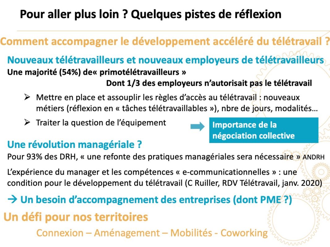 - Il y a également eu un rééquilibrage entre encadrants et non encadrants puisque les derniers faisaient moins de télétravail avant (non encadrants : 95 % contre 39 % avant, 57 % primo-télétravailleurs; encadrants : 97 % contre 50 %, 47 % primo-télétravailleurs).