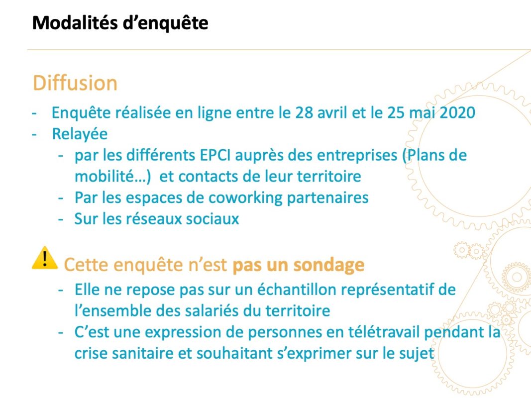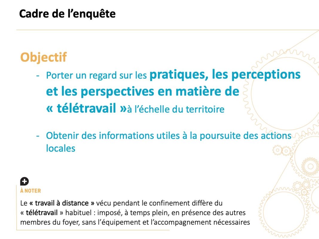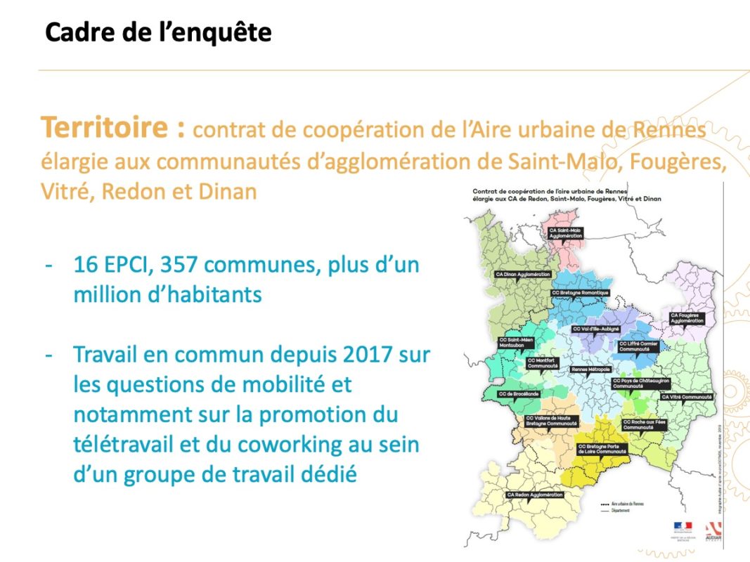 Entre le 28 avril et le 25 mai 2020, pendant la crise sanitaire du Covid-19, le Bureau des temps de la Ville de Rennes et de Rennes Métropole a proposé une enquête en ligne sur le télétravail, à destination des habitants de l’aire urbaine de Rennes élargie aux communautés d’agglomération de Saint-Malo, Fougères, Vitré, Redon et Dinan (16 EPCI, 357 communes, soit plus d’un million d’habitants). L’objectif de cette enquête est de porter un regard sur les pratiques, les perceptions et les perspectives en matière de télétravail à l’échelle du territoire et d’obtenir des informations utiles à la poursuite des actions locales en la matière. 2 200 personnes ont répondu à l’enquête parmi lesquelles 96 % ont exercé en télétravail pendant le confinement. Il s’agit donc d’une expression de personnes en télétravail pendant la crise sanitaire et souhaitant s’exprimer sur le sujet.