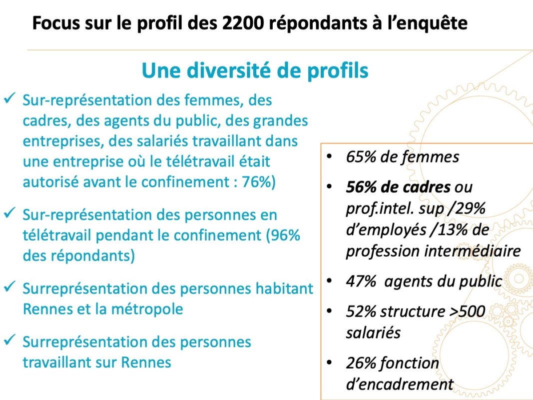 L’enquête a principalement touché des personnes en télétravail pendant le confinement (96 % des répondants). Pour mémoire : l’estimation de télétravailleurs en France pendant le confinement se situe aux alentours de 25-30 %.