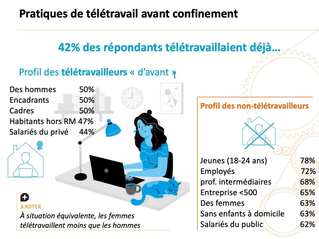 - 42 % des répondants télétravaillaient déjà et 88 % souhaitent télétravailler après la crise