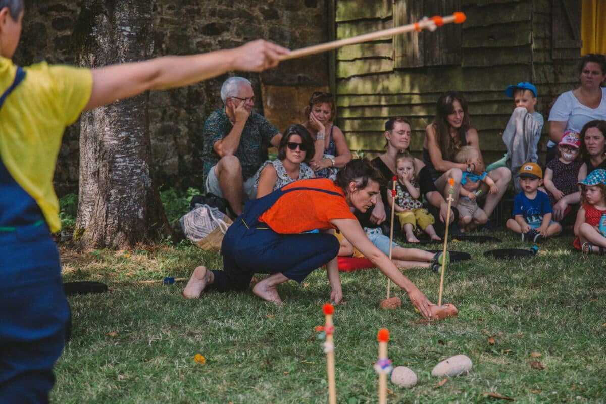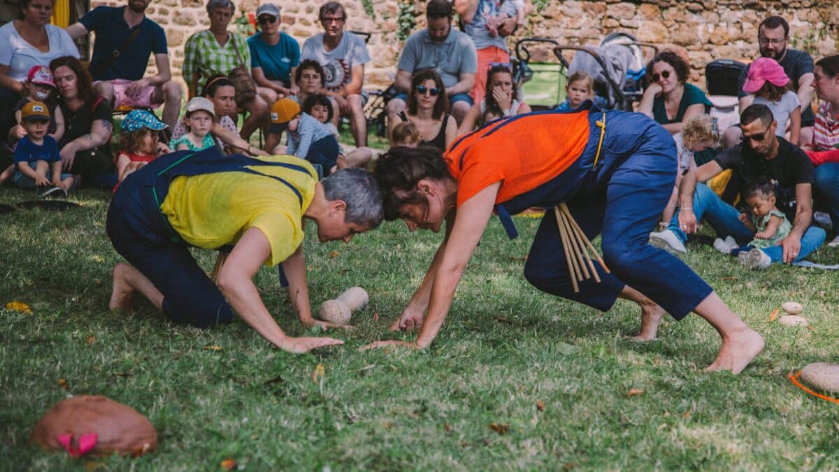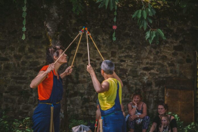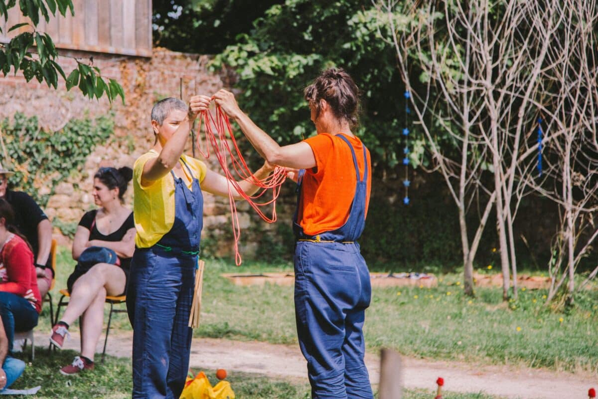 À partir des matériaux scénographiques et chorégraphiques de la pièce cabane, Coline Duval et Albane Aubry proposent une version pour les dehors : un duo de bâtisseuses accueillent un groupe de petits habitants à venir s’installer sur des coussins tout-terrain, tout-autour et, au milieu, quelques gros cailloux bien choisis ; des pelotes de ficelles enroulées sur elles-mêmes, orange et verte et jaune ; des branches fourchues, percées, bricolées, et de quoi les planter, de la terre crue façonnée où enfoncer ses doigts pour tenir les toits-ciels. Elles construiront, avec souffles et baisers de leurs pieds sur la terre, comme les pattes des chats, un campement rose fuchsia et vert pomme. L’espace de la performance se découvre, se transforme, s’habite et se construit avec le jeune public pour devenir un terrain de jeu où se fier à ses sensations et ressentir nos liens aux vivants. La parole est chantée, la danse est architecturée, l’une et l’autre font corps pour dessiner le campement, accrocher les lignes, et partager et construire avec les tout-petits, leurs abris.