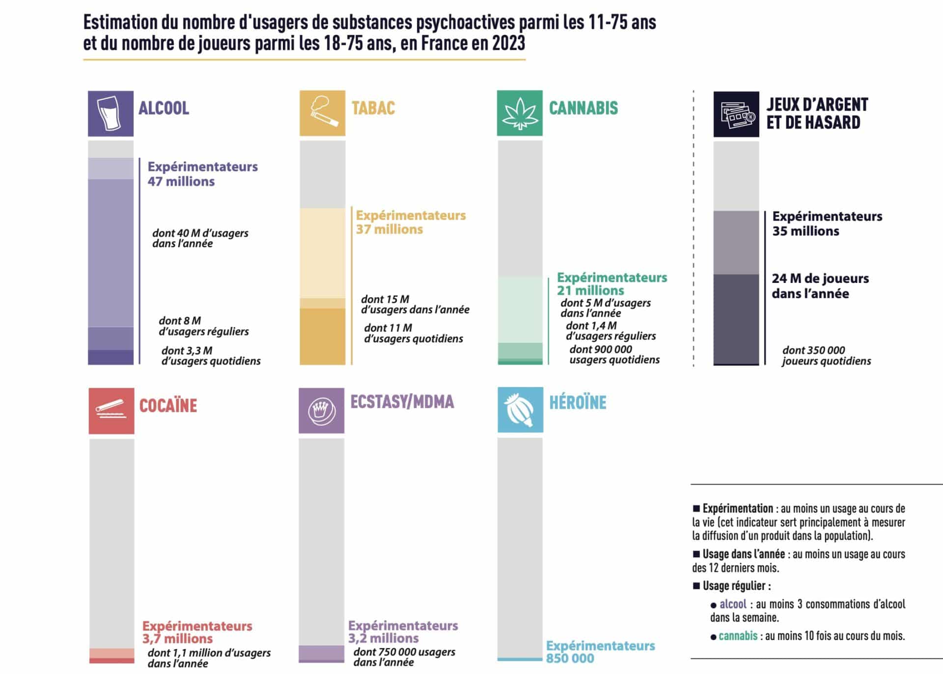 - Cannabis : environ 900 000 usagers quotidiens en France ; substance illicite la plus consommée.