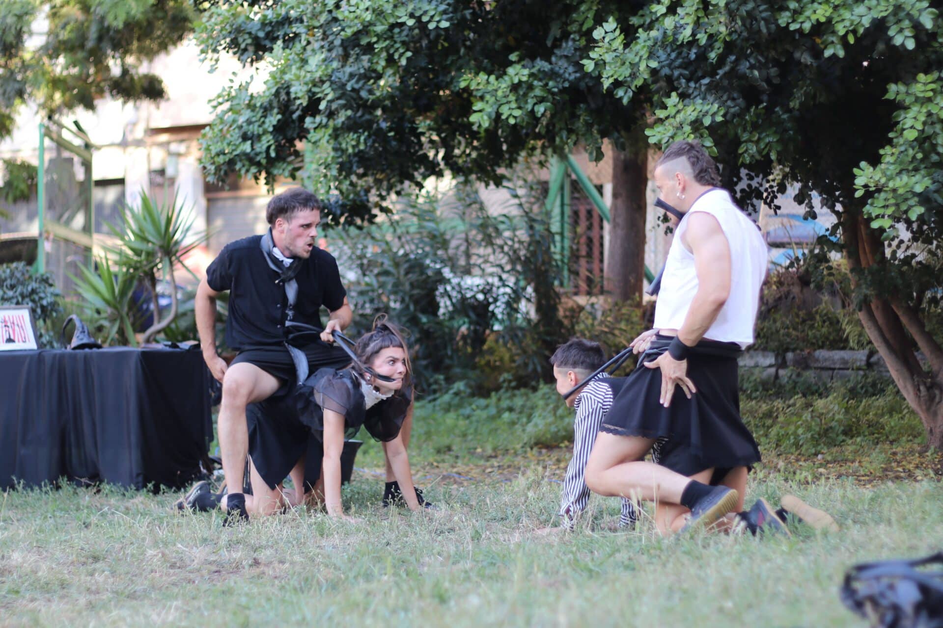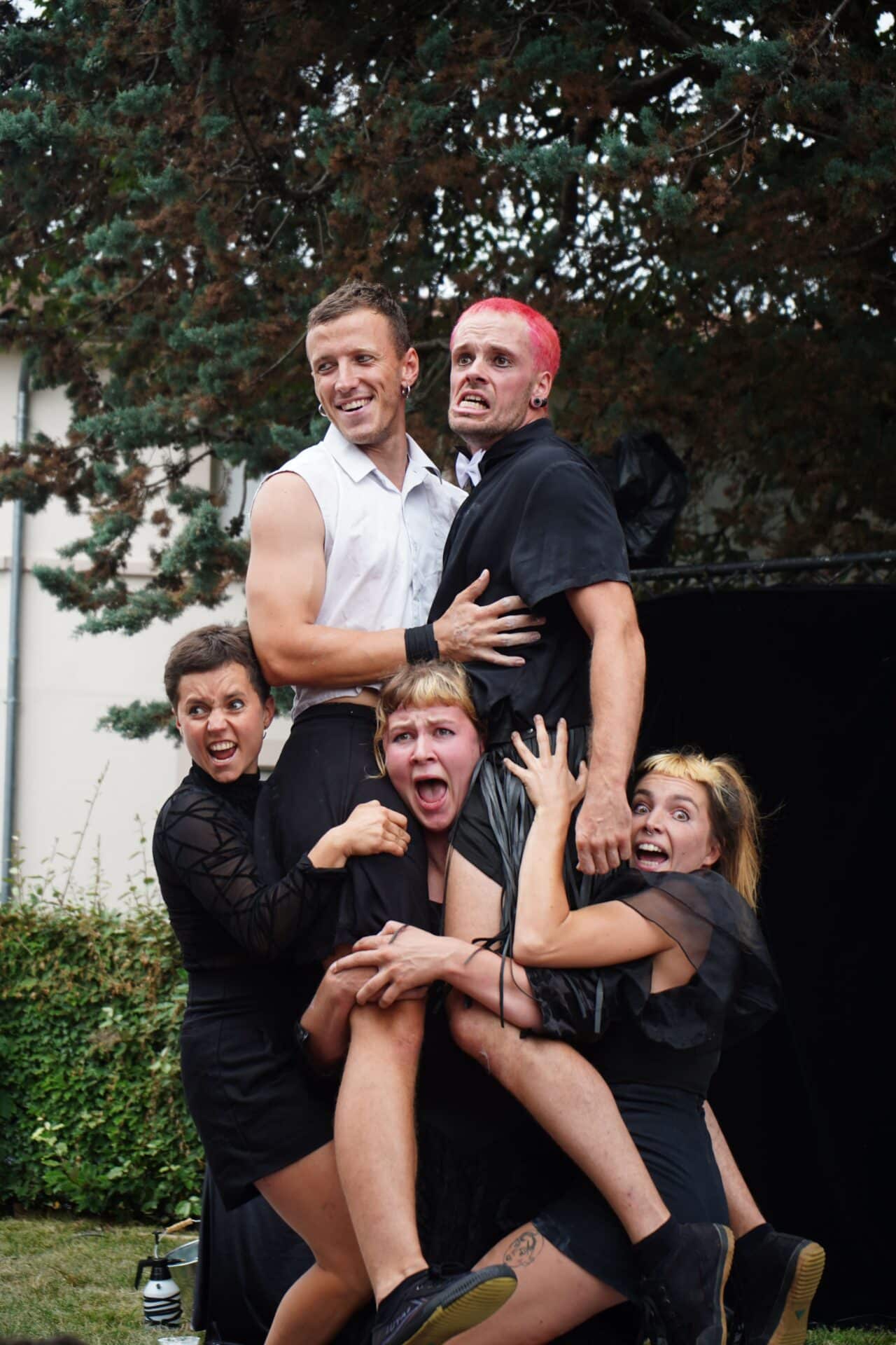 Ce sera pire après n’est pas exclusivement un spectacle de porté : c’est une création hybride dans laquelle le théâtre sert à part égale le cirque et inversement. « On adore le porté, c’est ce qui nous unit, mais voir un spectacle 100% technique nous ennuie souvent. » La compagnie met en scène cinq individus disloqués dans une succession de tableaux absurdes, du Moyen-Âge à aujourd’hui. “On a eu beaucoup de discussions sur la politisation de notre spectacle ou non« , avoue Baptiste. “Ce n’est pas possible de faire du spectacle vivant sans que ce soit politique« , mais si les sujets les touchent et les intéressent en termes d’idées, ils ont conscience d’avoir eu la chance de ne pas vivre de grandes difficultés. La création prend sa source dans l’humour noir et la satire afin de rester dans la légèreté et ne pas tomber dans la moralisation. “Ce sont plus des clins d’œil”, précise Apolline, aussi bien sociales, sociétales qu’environnementales : consentement, féminisme, pollution, le rapport à l’autre, etc. Les expressions exagérées et les situations cocaces allègent le propos pour un moment de divertissement.