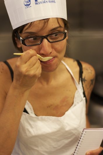 Le menu du jour – entrée, plat, dessert – est réalisé par le groupe dans un espace commun, ouvert, qui favorise les échanges. Les ingrédients savamment choisis incitent à la découverte et au façonnage d’une cuisine du marché « Panna cotta au lait ribot et au yuzu, vinaigrette de coque et pomme reinette aux algues pour l’entrée, thon mariné au saké, gingembre, enrobé de fruits secs et chou chinois pour le plat et pour le dessert, sablé Breton à la poudre d’amande et à la fleur d’oranger, crème au jus de fruits, salade d’orange à la menthe et à la cannelle ». Miam miam…