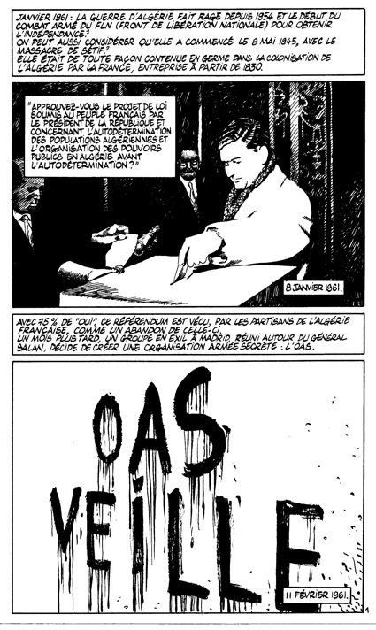 La reconstitution du Paris du début des années soixante, avec ses scènes de manifestations, est établie dans de grandes cases, dessinées dans un noir et blanc contrasté ou les noirs épais et poisseux sont réalisés au pinceau, avec de l’encre de chine et du noir vinylique. Ce style de clair-obscur inquiétant décrit bien les ambiances urbaines nocturnes avec ces personnages aux longs imperméables, aux chaussures lourdes, aux cheveux gominés. Pas de clichés cependant, on ne retrouve pas les artifices séduisants, le glamour