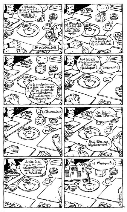 Les planches de dialogue ont pour base un gaufrier de huit cases identiques. Dans chaque case est répété le dessin d’une table. Les membres de la famille sont attablés autour d’un café, mais dans le cadre de l’image, on ne voit apparaître que leurs bras et leurs mains. Découvrir leurs visages nous permettrait-il de mieux cerner les enjeux de la fin de la guerre d’Algérie (2) ? Certainement pas ! Mais le lecteur de bandes dessinées, voyeur en puissance ou animal aux yeux inquiets, peut se sentir frustré, car on lui cache des choses ! Les conversations sont figurées dans des bulles de dialogue ovales avec un texte en minuscules. Le dessin reste très sobre, juste un contour neutre, pas d’ombrage pour ainsi dire.